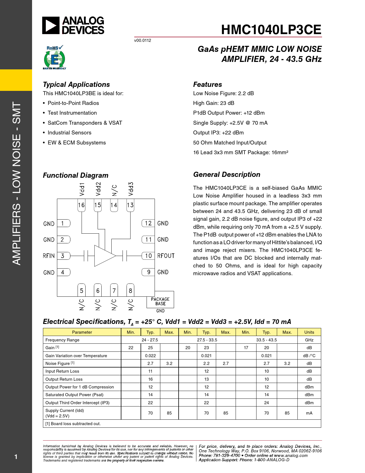 HMC1040LP3CE v00.0112 GaAs pHEMT MMIC LOW NOISEAMPLIFIER, 24 - 43.5 GHzTypical ApplicationsFeatures This HmC1040lp3Be is ideal for: low Noise figure: 2.2 dB T • Point-to-Point Radios High Gain: 23 dB m • Test Instrumentation p1dB output power: +12 dBm s • SatCom Transponders & VSAT single supply: +2.5V @ 70 mA e - • Industrial Sensors output ip3: +22 dBm is • EW & ECM Subsystems 50 ohm matched input/output o 16 lead 3x3 mm smT package: 16mm² w N Functional DiagramGeneral Description lo The HMC1040LP3CE is a self-biased GaAs MMIC low Noise Amplifier housed in a leadless 3x3 mm s - plastic surface mount package. The amplifier operates r between 24 and 43.5 GHz, delivering 23 dB of small ie signal gain, 2.2 dB noise figure, and output IP3 of +22 dBm, while requiring only 70 mA from a +2.5 V supply. lif The P1dB output power of +12 dBm enables the LNA to p function as a LO driver for many of Hittite’s balanced, I/Q m and image reject mixers. The HmC1040lp3Ce fe- A atures I/Os that are DC blocked and internal y mat- ched to 50 Ohms, and is ideal for high capacity microwave radios and VsAT applications. Electrical Specifications, T = +25° C, Vdd1 = Vdd2 = Vdd3 = +2.5V, Idd = 70 mAA parameter min. Typ. max. min. Typ. max. min. Typ. max. Units Frequency Range 24 - 27.5 27.5 - 33.5 33.5 - 43.5 GHz Gain [1] 22 25 20 23 17 20 dB Gain Variation over Temperature 0.022 0.021 0.021 dB /°C Noise figure [1] 2.7 3.2 2.2 2.7 2.7 3.2 dB input return loss 11 12 10 dB output return loss 16 13 10 dB output power for 1 dB Compression 12 12 12 dBm saturated output power (psat) 14 14 14 dBm output Third order intercept (ip3) 22 22 24 dBm supply Current (idd) 70 85 70 85 70 85 mA (Vdd = 2.5V) [1] Board loss subtracted out. Inf F or o m r p atio r n ifc ur e n , d ishe e d lbiv y e A r n y a alog n D d t evic o p es is la beclie o eved rd to ebre sa: H ccur iattti e tae M nd re ilicarbloew . H a o ve C wever, o n rp o For price, delivery, and to place orders: Analog Devices, Inc., responsibility is assumed by Analog Devices for its use, nor for any infringements of patents or other oration, 2 Elizabeth Drive, Chelmsford, MA 01824 One Technology Way, P.O. Box 9106, Norwood, MA 02062-9106 Phone: 978-250-3343 Fax: 978-250-3373 O rights of third parties that may result from its use. Specifications subject to change without notice. No P rd ho e ne r O : 7 n 81- -3li 2n 9 e a -47 t w 0 w 0 • O w rd .h e it r o tniltie n .c e ao t m 1 license is granted by implication or otherwise under any patent or patent rights of Analog Devices. www.analog.com Application Support: Pho Trademarks and registered trademarks are the property of their respective owners. ne: 978-250-33 A 4 p 3 o plica r a tio p n S p u s p @ po h rt itt : P ite ho . n c e o : 1m -800-ANALOG-D