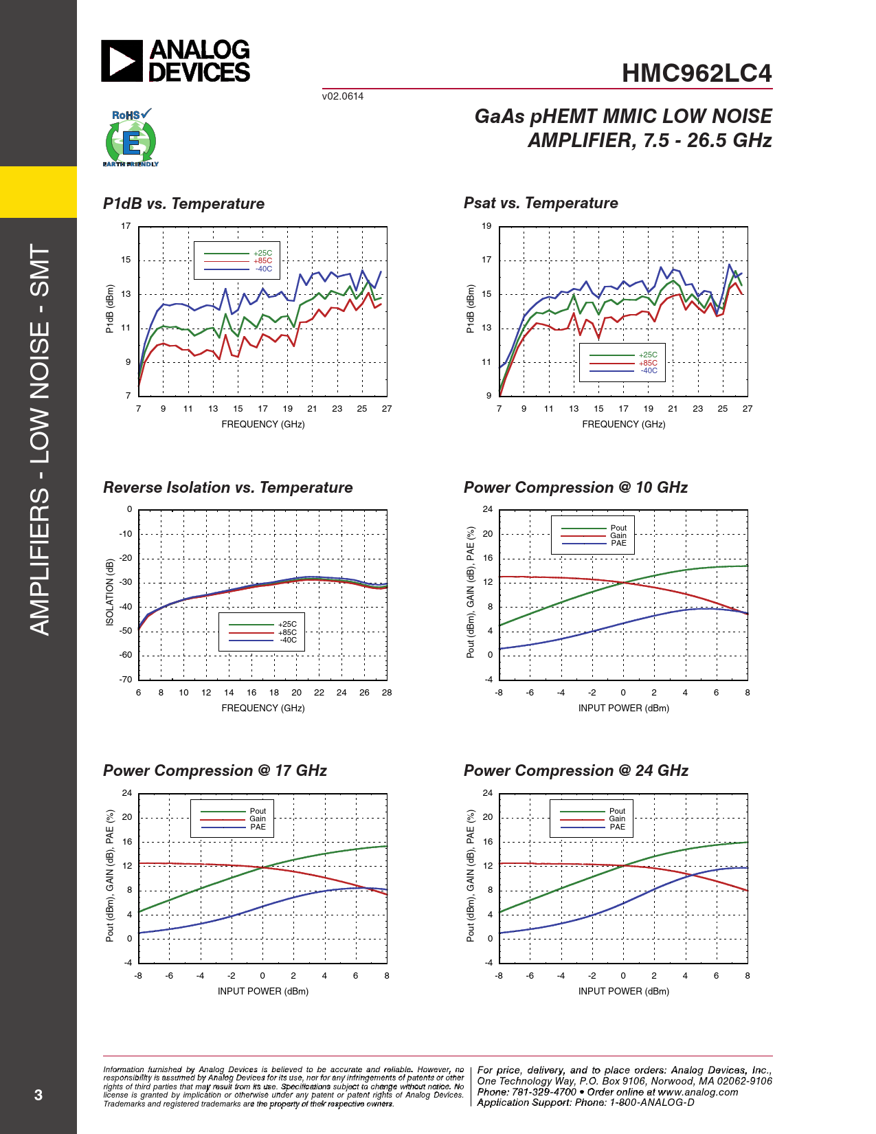 HMC962LC4 v02.0614 GaAs pHEMT MMIC LOW NOISEAMPLIFIER, 7.5 - 26.5 GHzP1dB vs. TemperaturePsat vs. Temperature 17 19 T +25C m 15 +85C 17 -40C s 13 15 (dBm) (dBm) e - 11 13 P1dB P1dB is +25C o 9 11 +85C -40C 7 9 w N 7 9 11 13 15 17 19 21 23 25 27 7 9 11 13 15 17 19 21 23 25 27 FREQUENCY (GHz) FREQUENCY (GHz) lo s - Reverse Isolation vs. TemperaturePower Compression @ 10 GHz r 0 24 ie Pout -10 20 Gain (%) PAE ) -20 PAE 16 lif p (dB N -30 (dB), 12 IO m T LA -40 GAIN 8 A O IS +25C -50 +85C 4 (dBm), -40C -60 Pout 0 -70 -4 6 8 10 12 14 16 18 20 22 24 26 28 -8 -6 -4 -2 0 2 4 6 8 FREQUENCY (GHz) INPUT POWER (dBm) Power Compression @ 17 GHzPower Compression @ 24 GHz 24 24 Pout Pout 20 Gain 20 Gain (%) (%) PAE PAE PAE 16 PAE 16 (dB), (dB), 12 12 GAIN 8 GAIN 8 4 4 (dBm), (dBm), Pout 0 Pout 0 -4 -4 -8 -6 -4 -2 0 2 4 6 8 -8 -6 -4 -2 0 2 4 6 8 INPUT POWER (dBm) INPUT POWER (dBm) Inf F or o m r p atio r n ifc ur e n , d ishe e d lbiv y e A r n y a alog n D d t evic o p es is la beclie o eved rd to ebre sa: H ccur iattti e tae M nd re ilicarbloew . H a o ve C wever, o n rp o For price, delivery, and to place orders: Analog Devices, Inc., responsibility is assumed by Analog Devices for its use, nor for any infringements of patents or other oration, 2 Elizabeth Drive, Chelmsford, MA 01824 One Technology Way, P.O. Box 9106, Norwood, MA 02062-9106 Phone: 978-250-3343 Fax: 978-250-3373 O rights of third parties that may result from its use. Specifications subject to change without notice. No P rd hone e r O : 7 n 81- -3li 2n 9 e a -47 t w 0 w 0 • O w rd .h e it r o t niltie n .c e ao t m 3 license is granted by implication or otherwise under any patent or patent rights of Analog Devices. www.analog.com Application Support: Pho Trademarks and registered trademarks are the property of their respective owners. ne: 978-250-33 A 4 p 3 o plica r a tio p n S p u s p @ po h rt itt : P ite ho . n c e o : 1m -800-ANALOG-D