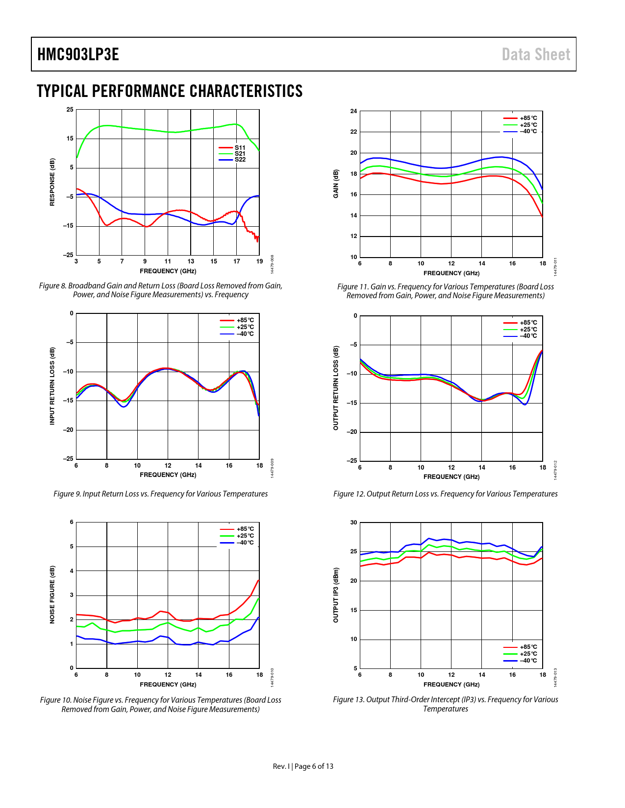 14479- Figure 10. Noise Figure vs. Frequency for Various Temperatures (Board Loss Figure 13. Output Third-Order Intercept (IP3) vs. Frequency for Various Removed from Gain, Power, and Noise Figure Measurements) Temperatures Rev. I | Page 6 of 13 Document Outline Features Applications Functional Block Diagram General Description Revision History Specifications 6 GHz to 16 GHz Frequency Range 16 GHz to 17 GHz Frequency Range Absolute Maximum Ratings Thermal Resistance ESD Caution Pin Configuration and Function Descriptions Interface Schematics Typical Performance Characteristics Theory of Operation Applications Information Recommended Bias Sequence During Power Up Recommended Bias Sequence During Power Down Evaluation PCB Typical Application Circuits Outline Dimensions Ordering Guide