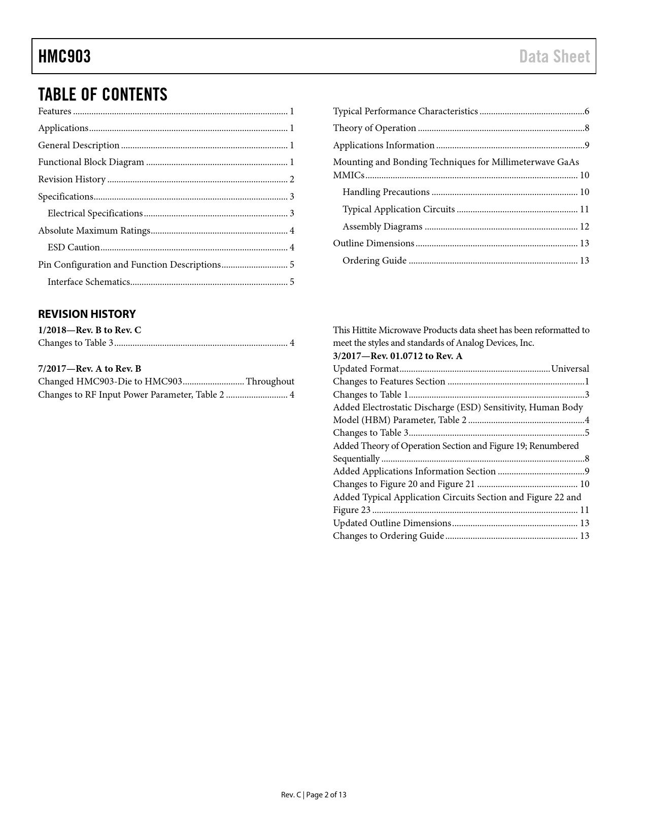 HMC903 Data Sheet TABLE OF CONTENTS REVISION HISTORY 1/2018—Rev B to Rev C 3/2017—Rev 01.0712 to Rev A