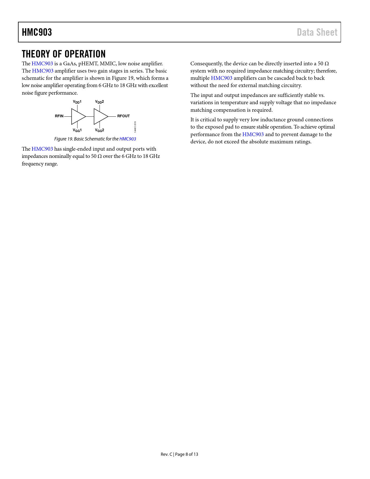 Seiten / Seite13 / 8 — HMC903. Data Sheet. THEORY OF OPERATION. VDD1. VDD2. RFIN. RFOUT. VGG1. …