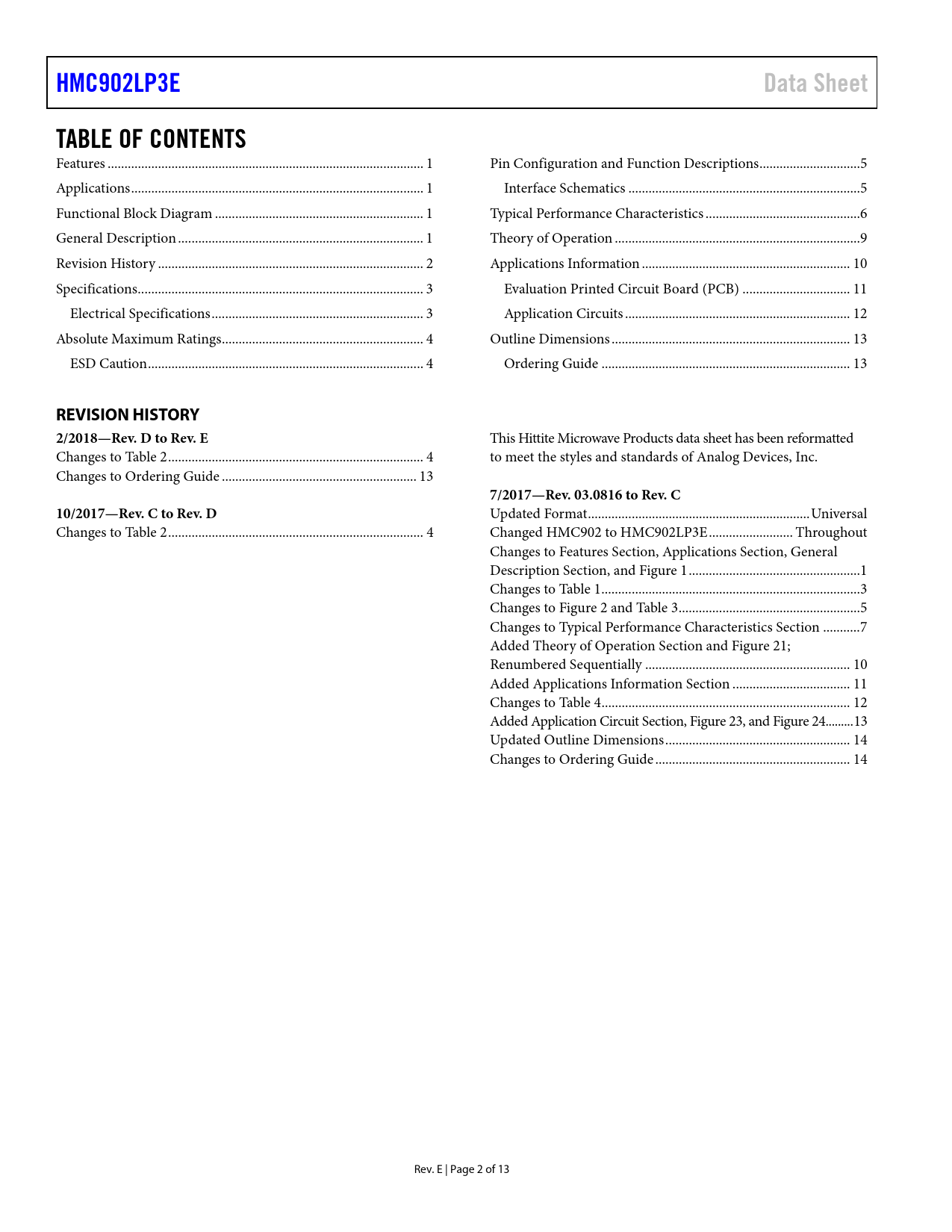 link to page 1 link to page 1 link to page 1 link to page 1 link to page 2 link to page 3 link to page 3 link to page 4 link to page 4 link to page 5 link to page 5 link to page 6 link to page 9 link to page 10 link to page 11 link to page 12 link to page 13 link to page 13 HMC902LP3EData SheetTABLE OF CONTENTS Features .. 1 Pin Configuration and Function Descriptions ..5 Applications ... 1 Interface Schematics ...5 Functional Block Diagram .. 1 Typical Performance Characteristics ..6 General Description ... 1 Theory of Operation ...9 Revision History ... 2 Applications Information .. 10 Specifications ... 3 Evaluation Printed Circuit Board (PCB) .. 11 Electrical Specifications ... 3 Application Circuits ... 12 Absolute Maximum Ratings .. 4 Outline Dimensions ... 13 ESD Caution .. 4 Ordering Guide .. 13 REVISION HISTORY 2/2018—Rev. D to Rev. E This Hittite Microwave Products data sheet has been reformatted Changes to Table 2 .. 4 to meet the styles and standards of Analog Devices, Inc. Changes to Ordering Guide .. 13 7/2017—Rev. 03.0816 to Rev. C10/2017—Rev. C to Rev. D Updated Format .. Universal Changes to Table 2 .. 4 Changed HMC902 to HMC902LP3E ... Throughout Changes to Features Section, Applications Section, General Description Section, and Figure 1 ... 1 Changes to Table 1 ... 3 Changes to Figure 2 and Table 3 .. 5 Changes to Typical Performance Characteristics Section ... 7 Added Theory of Operation Section and Figure 21; Renumbered Sequentially ... 10 Added Applications Information Section ... 11 Changes to Table 4 .. 12 Added Application Circuit Section, Figure 23, and Figure 24... 13 Updated Outline Dimensions ... 14 Changes to Ordering Guide .. 14 Rev. E | Page 2 of 13 Document Outline FEATURES APPLICATIONS FUNCTIONAL BLOCK DIAGRAM GENERAL DESCRIPTION TABLE OF CONTENTS REVISION HISTORY SPECIFICATIONS ELECTRICAL SPECIFICATIONS ABSOLUTE MAXIMUM RATINGS ESD CAUTION PIN CONFIGURATION AND FUNCTION DESCRIPTIONS INTERFACE SCHEMATICS TYPICAL PERFORMANCE CHARACTERISTICS THEORY OF OPERATION APPLICATIONS INFORMATION EVALUATION PRINTED CIRCUIT BOARD (PCB) APPLICATION CIRCUITS OUTLINE DIMENSIONS ORDERING GUIDE