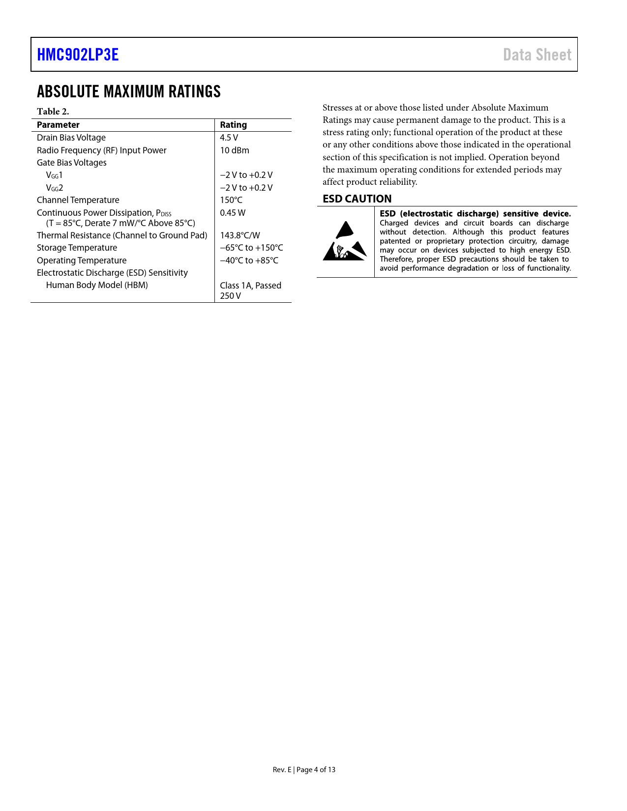HMC902LP3EData SheetABSOLUTE MAXIMUM RATINGS Table 2. Stresses at or above those listed under Absolute Maximum ParameterRating Ratings may cause permanent damage to the product. This is a stress rating only; functional operation of the product at these Drain Bias Voltage 4.5 V or any other conditions above those indicated in the operational Radio Frequency (RF) Input Power 10 dBm section of this specification is not implied. Operation beyond Gate Bias Voltages the maximum operating conditions for extended periods may VGG1 −2 V to +0.2 V affect product reliability. VGG2 −2 V to +0.2 V Channel Temperature 150°C ESD CAUTION Continuous Power Dissipation, PDISS 0.45 W (T = 85°C, Derate 7 mW/°C Above 85°C) Thermal Resistance (Channel to Ground Pad) 143.8°C/W Storage Temperature −65°C to +150°C Operating Temperature −40°C to +85°C Electrostatic Discharge (ESD) Sensitivity Human Body Model (HBM) Class 1A, Passed 250 V Rev. E | Page 4 of 13 Document Outline FEATURES APPLICATIONS FUNCTIONAL BLOCK DIAGRAM GENERAL DESCRIPTION TABLE OF CONTENTS REVISION HISTORY SPECIFICATIONS ELECTRICAL SPECIFICATIONS ABSOLUTE MAXIMUM RATINGS ESD CAUTION PIN CONFIGURATION AND FUNCTION DESCRIPTIONS INTERFACE SCHEMATICS TYPICAL PERFORMANCE CHARACTERISTICS THEORY OF OPERATION APPLICATIONS INFORMATION EVALUATION PRINTED CIRCUIT BOARD (PCB) APPLICATION CIRCUITS OUTLINE DIMENSIONS ORDERING GUIDE