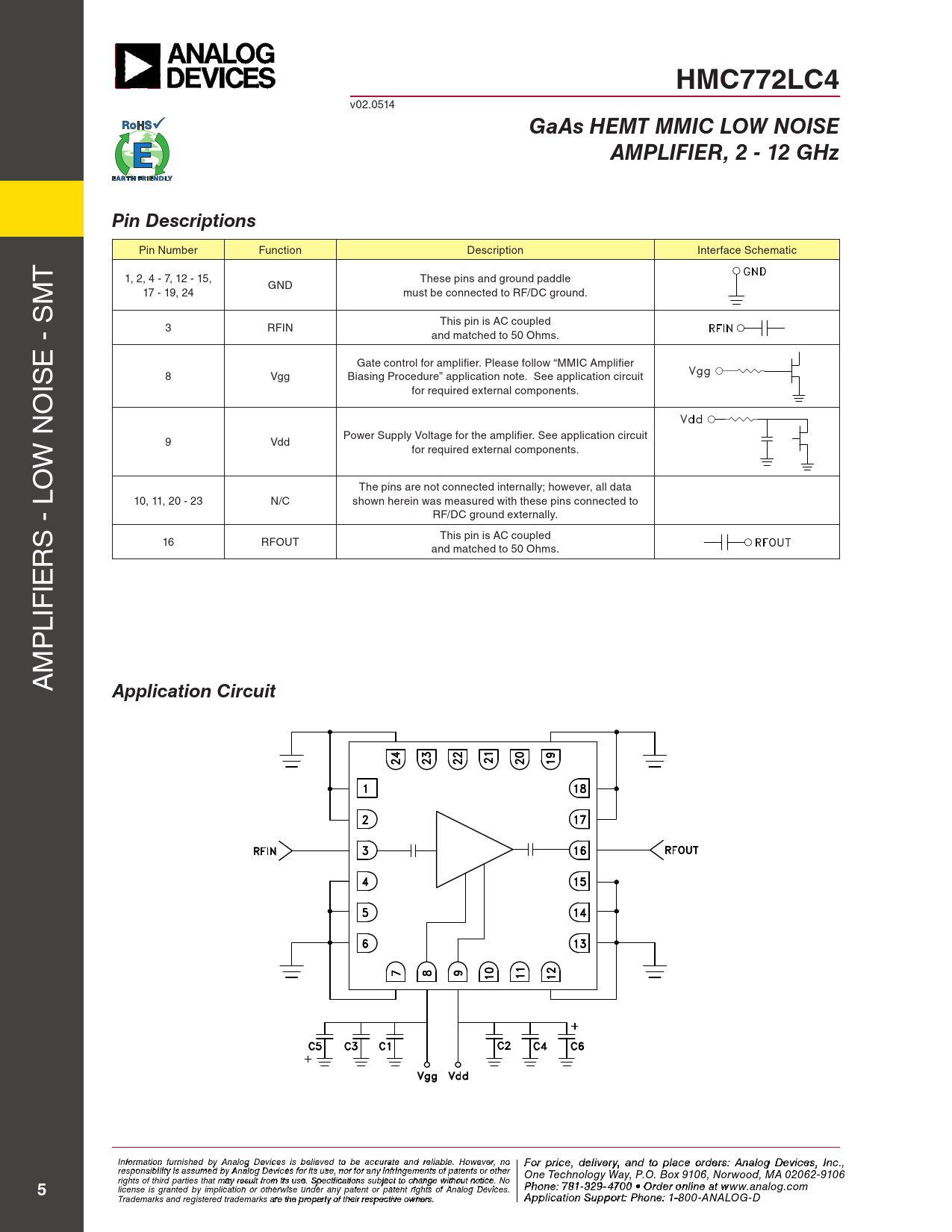 HMC772LC4 v02.0514 GaAs HEMT MMIC LOW NOISEAMPLIFIER, 2 - 12 GHzPin Descriptions Pin Number Function Description Interface Schematic T 1, 2, 4 - 7, 12 - 15, These pins and ground paddle M GND 17 - 19, 24 must be connected to RF/DC ground. This pin is AC coupled 3 RFIN and matched to 50 Ohms. E - S Gate control for amplifier. Please follow “MMIC Amplifier IS 8 Vgg Biasing Procedure” application note. See application circuit O for required external components. Power Supply Voltage for the amplifier. See application circuit 9 Vdd W N for required external components. O The pins are not connected internally; however, all data 10, 11, 20 - 23 N/C shown herein was measured with these pins connected to RF/DC ground externally. S - L This pin is AC coupled R 16 RFOUT and matched to 50 Ohms. IE LIF P M A Application Circuit I F nf o or r p mati r o in cfe ur , d nish e e l d iv b e y r A y a nalo n g d t Devi o p ces i la s c bele o ieve rd d t e o rbs e : H acc iutrtatite e M and ic reli rao bl w e. a H v o e C wever o , nrp o For price, delivery, and to place orders: Analog Devices, Inc., responsibility is assumed by Analog Devices for its use, nor for any infringements of patents or other oration, 2 Elizabeth Drive, Chelmsford, MA 01824 One Technology Way, P.O. Box 9106, Norwood, MA 02062-9106 Phone: 978-250-3343 Fax: 978-250-3373 O rights of third parties that may result from its use. Specifications subject to change without notice. No rd Phoe n r O e: 7 n- 81-li 3 n 2 e a 9-4 t w 70 ww 0 • O . rdh e itt r o it nle i . n co e a m 5 license is granted by implication or otherwise under any patent or patent rights of Analog Devices. t www.analog.com Application Support: Phon Trademarks and registered trademarks are the property of their respective owners. e: 978-250-334 A 3 o pplic r a atio pp n S s u @ p h por ittti : Pte ho.c n o e m : 1-800-ANALOG-D