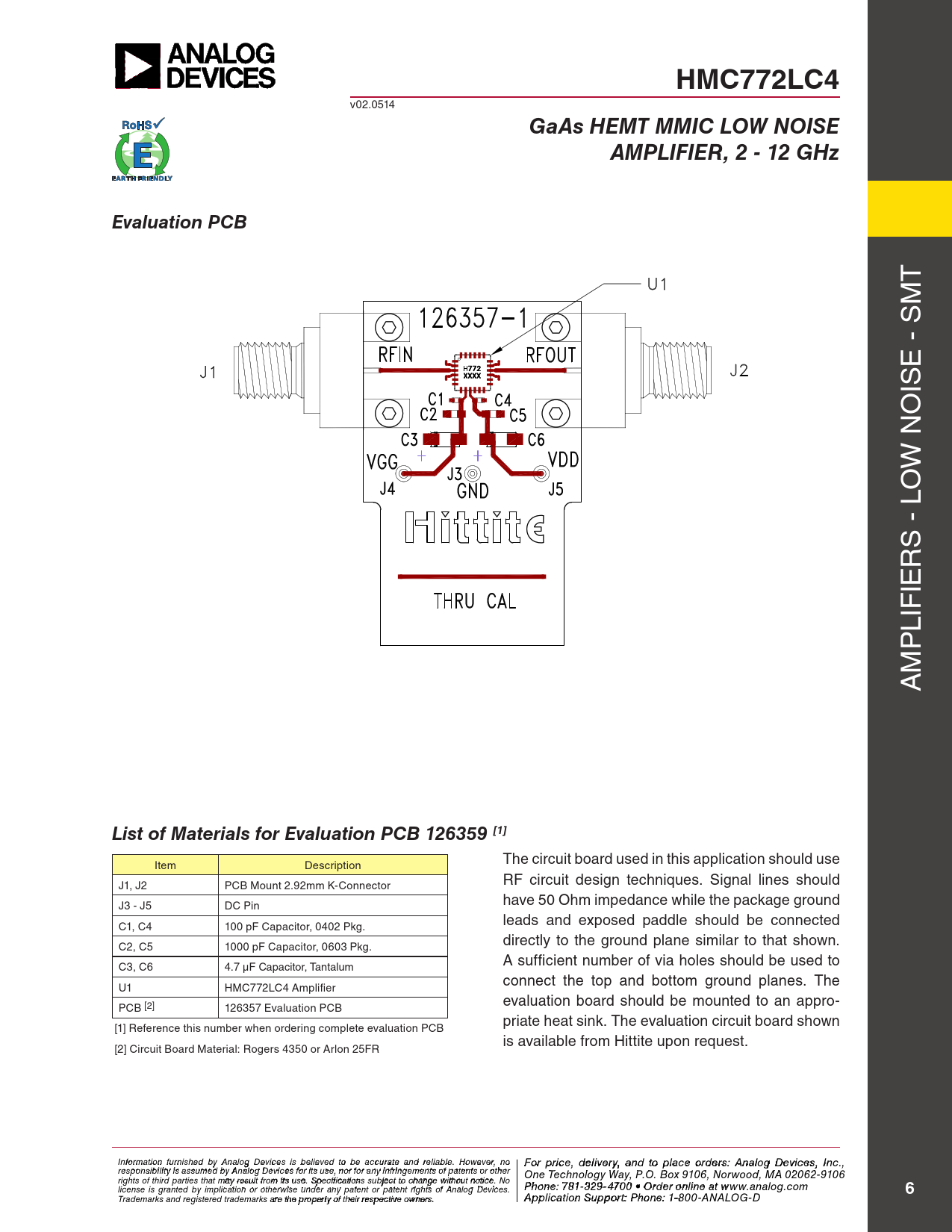 HMC772LC4 v02.0514 GaAs HEMT MMIC LOW NOISEAMPLIFIER, 2 - 12 GHzEvaluation PCB T M E - S IS O W N O S - L R IE LIF P M A List of Materials for Evaluation PCB 126359 [1] Item Description The circuit board used in this application should use J1, J2 PCB Mount 2.92mm K-Connector RF circuit design techniques. Signal lines should have 50 Ohm impedance while the package ground J3 - J5 DC Pin leads and exposed paddle should be connected C1, C4 100 pF Capacitor, 0402 Pkg. directly to the ground plane similar to that shown. C2, C5 1000 pF Capacitor, 0603 Pkg. A sufficient number of via holes should be used to C3, C6 4.7 µF Capacitor, Tantalum connect the top and bottom ground planes. The U1 HMC772LC4 Amplifier evaluation board should be mounted to an appro- PCB [2] 126357 Evaluation PCB priate heat sink. The evaluation circuit board shown [1] Reference this number when ordering complete evaluation PCB is available from Hittite upon request. [2] Circuit Board Material: Rogers 4350 or Arlon 25FR I F nf o or r p mati r o in cfe ur , d nish e e l d iv b e y r A y a nalo n g d t Devi o p ces i la s c bele o ieve rd d t e o rbs e : H acc iutrtatite e M and ic reli rao bl w e. a H v o e C wever o , nrp o For price, delivery, and to place orders: Analog Devices, Inc., responsibility is assumed by Analog Devices for its use, nor for any infringements of patents or other oration, 2 Elizabeth Drive, Chelmsford, MA 01824 One Technology Way, P.O. Box 9106, Norwood, MA 02062-9106 Phone: 978-250-3343 Fax: 978-250-3373 O rights of third parties that may result from its use. Specifications subject to change without notice. No rd Phoe n r O e: 7 n- 81-li 3 n 2 e a 9-4 t w 70 ww 0 • O . rdh e itt r o it nle i . n co e a m license is granted by implication or otherwise under any patent or patent rights of Analog Devices. t www.analog.com 6 Application Support: Phon Trademarks and registered trademarks are the property of their respective owners. e: 978-250-334 A 3 o pplic r a atio pp n S s u @ p h por ittti : Pte ho.c n o e m : 1-800-ANALOG-D