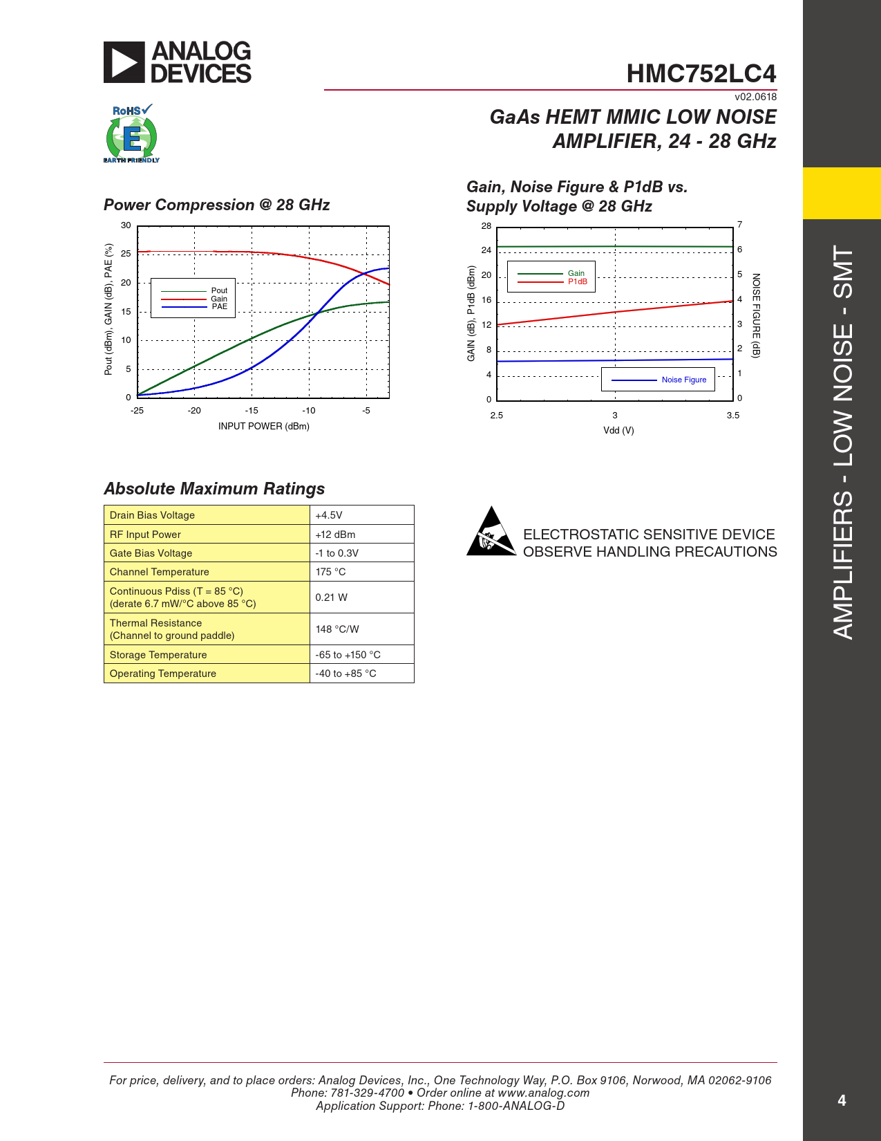 HMC752LC4 v02.0618 GaAs HEMT MMIC LOW NOISEAMPLIFIER, 24 - 28 GHzGain, Noise Figure & P1dB vs.Power Compression @ 28 GHzSupply Voltage @ 28 GHz 30 28 7 ) % 6 25 24 ( E T A ) m N 20 Gain 5 O ), P 20 B P1dB d IS M B Pout ( d E ( Gain B 16 4 d F PAE IN 1 IG 15 A ), P U 12 3 R ), G B d E m ( 10 ( d E - S B d IN 8 2 B A ) t ( u G IS o 5 P 4 1 Noise Figure O 0 0 0 -25 -20 -15 -10 -5 2.5 3 3.5 INPUT POWER (dBm) Vdd (V) W N O Absolute Maximum Ratings S - L Drain Bias Voltage +4.5V R RF Input Power +12 dBm ELECTROSTATIC SENSITIVE DEVICE IE Gate Bias Voltage -1 to 0.3V OBSERVE HANDLING PRECAUTIONS Channel Temperature 175 °C LIF Continuous Pdiss (T = 85 °C) 0.21 W (derate 6.7 mW/°C above 85 °C) P Thermal Resistance M 148 °C/W (Channel to ground paddle) A Storage Temperature -65 to +150 °C Operating Temperature -40 to +85 °C For price, delivery, and to place orders: Analog Devices, Inc., One Technology Way, P.O. Box 9106, Norwood, MA 02062-9106 Phone: 781-329-4700 • Order online at www.analog.com Application Support: Phone: 1-800-ANALOG-D 4 Document Outline Typical Applications Features Functional Diagram General Description Electrical Specifications Gain, Noise Figure & P1dB vs. Supply Voltage @ 28 GHz Power Compression @ 28 GHz Reverse Isolation vs. Temperature Psat vs. Temperature P1dB vs. Temperature Output IP3 vs. Idd Output IP3 vs. Temperature Noise Figure vs. Idd Noise Figure vs. Temperature Output Return Loss vs. Temperature Input Return Loss vs. Temperature Gain vs. Idd Gain vs. Temperature P1dB vs. Idd Absolute Maximum Ratings