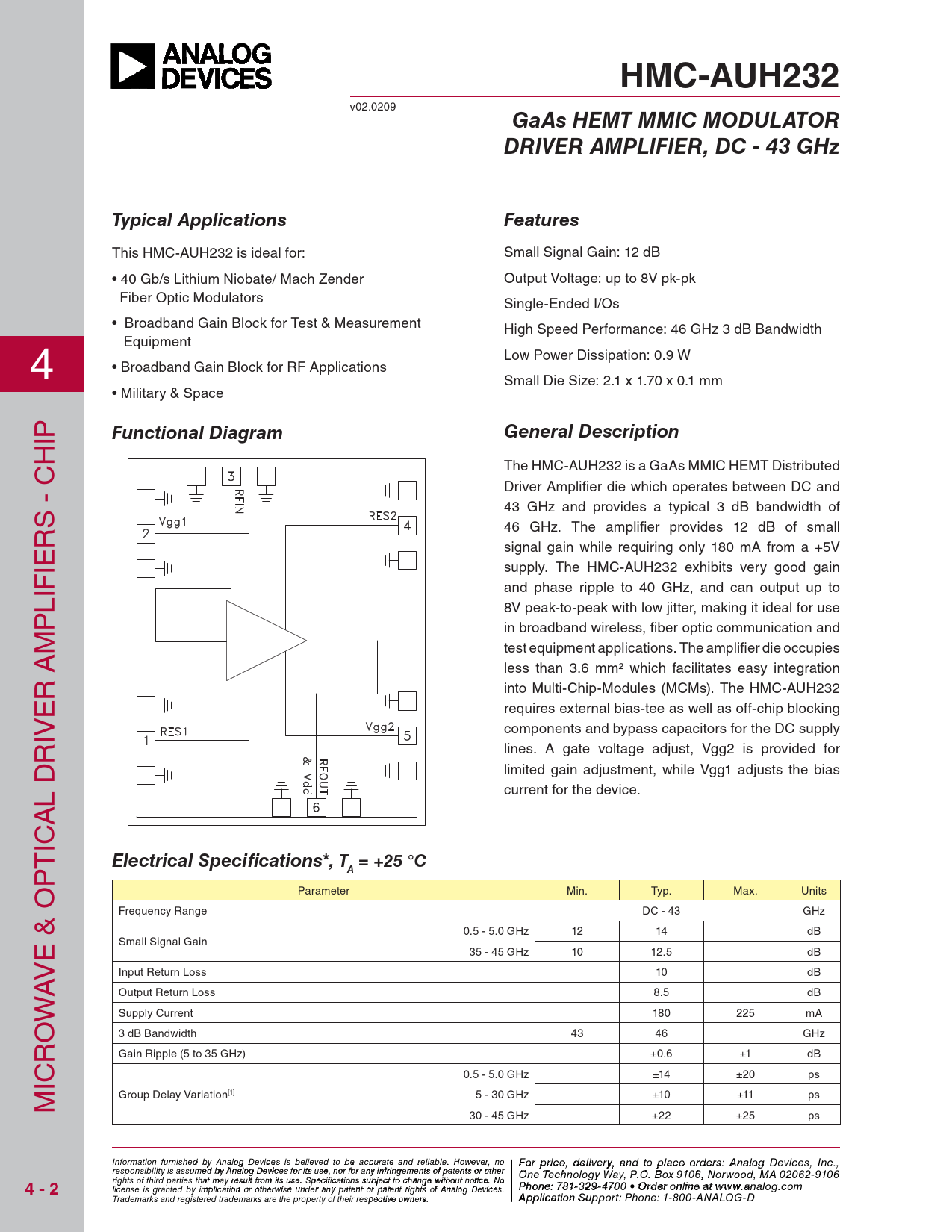 HMC-AUH232. GaAs HEMT MMIC MODULATOR. DRIVER AMPLIFIER, DC - 43 GHz. Typical Applications. Features. Functional Diagram