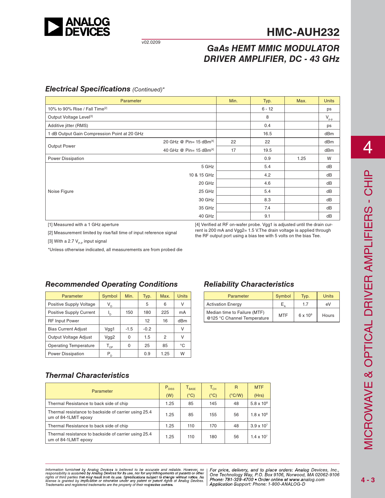 HMC-AUH232 GaAs HEMT MMIC MODULATOR DRIVER AMPLIFIER, DC - 43 GHz Electrical Specifi cations