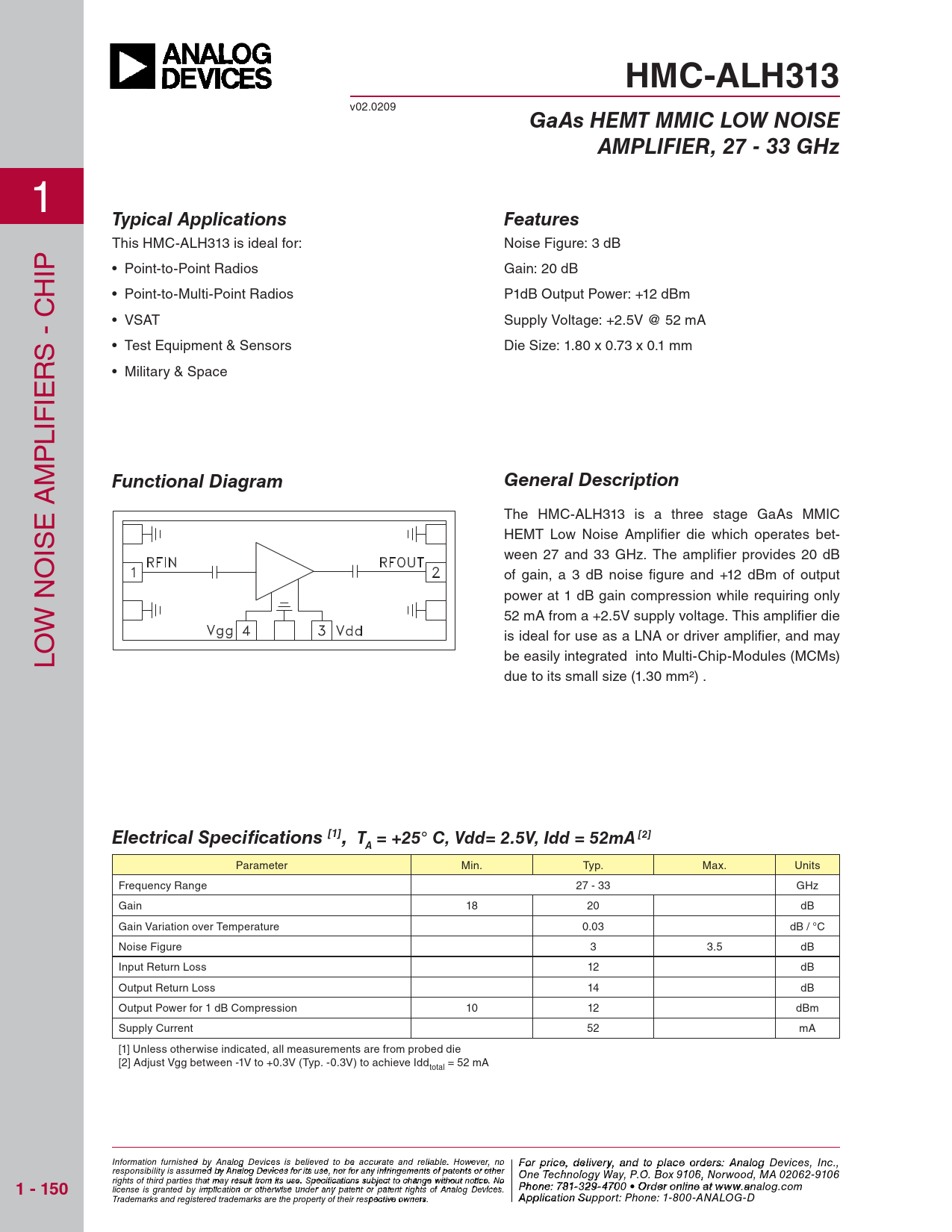 This HMC-ALH313 is ideal for: Noise Figure: 3 dB IP • Point-to-Point Radios Gain: 20 dB H • Point-to-Multi-Point Radios P1dB Output Power: +12 dBm C • VSAT Supply Voltage: +2.5V @ 52 mA - • Test Equipment & Sensors Die Size: 1.80 x 0.73 x 0.1 mm RS • Military & Space IE IF L P M
