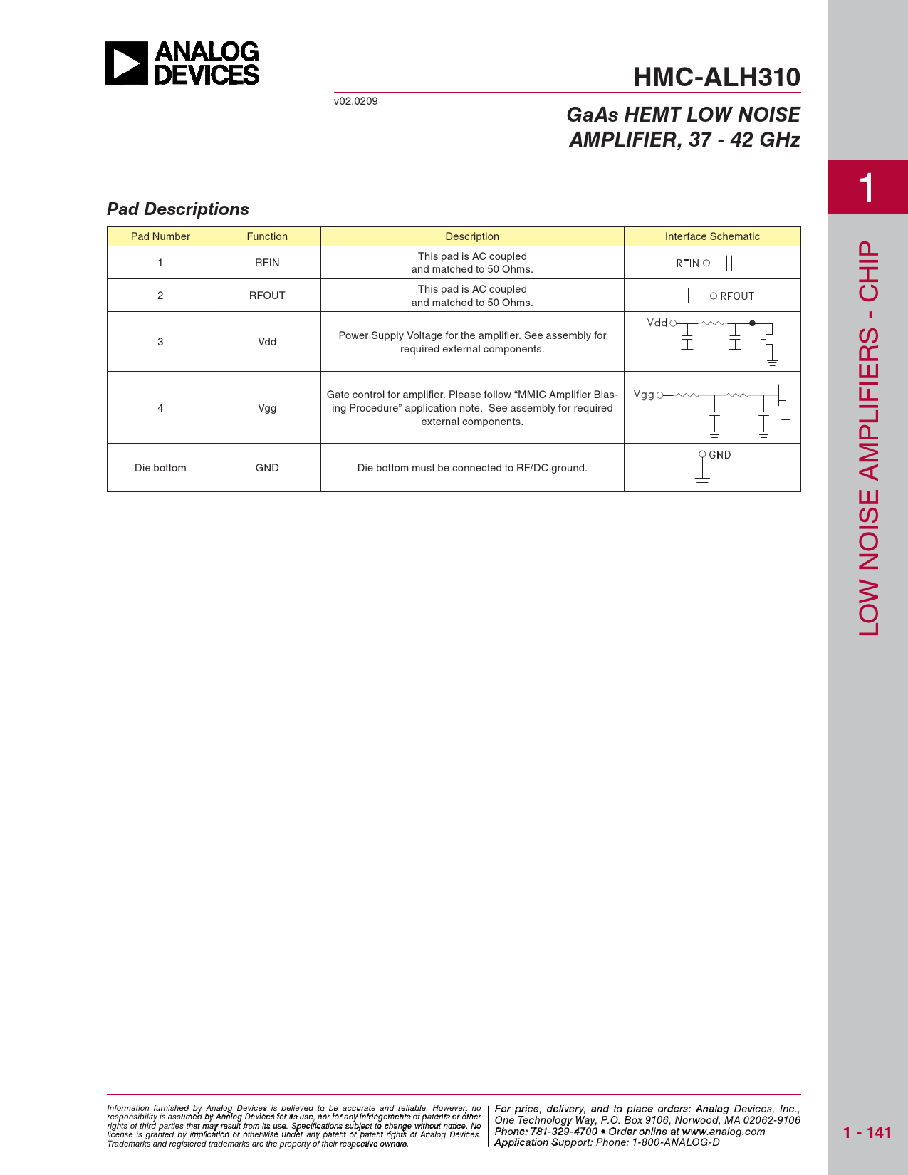 HMC-ALH310 v02.0209 GaAs HEMT LOW NOISEAMPLIFIER, 37 - 42 GHz 1 Pad Descriptions Pad Number Function Description Interface Schematic This pad is AC coupled 1 RFIN IP and matched to 50 Ohms. H This pad is AC coupled 2 RFOUT and matched to 50 Ohms. C - Power Supply Voltage for the amplifi er. See assembly for 3 Vdd required external components. RS IE Gate control for amplifi er. Please follow “MMIC Amplifi er Bias- 4 Vgg ing Procedure” application note. See assembly for required IF external components. L P M Die bottom GND Die bottom must be connected to RF/DC ground. A E IS O N W O L Information furnish F e o d r pri by An ce, de alog Devic leis vie s rby eli, a eve nd to pla d to be accur ce o ate an r d der relia s ble , pl . Ho ease co wever, no For price, delivery, and to place orders: Analog Devices, Inc., responsibility is assumed by Analog Devices for its use, nor for any infringements of patents or other ntact Hittite Microwave Corporation: One Technology Way, P.O. Box 9106, Norwood, MA 02062-9106 20 Alpha Road, Chelmsford, MA 01824 Phone rights of third parties that may result from its use. Specifications subject to change without notice. No : 978 Phon -e25 : 7 0 81 - - 3 3 3 29 4 - 3 F 470 ax 0 • O : 978 rder o - nl 25 in 0 e a - t 33 ww 73 license is granted by implication or otherwise under any patent or patent rights of Analog Devices. w.analog.com 1 - 141 Order On- Trademarks and registered trademarks are the property of their respective owners. line at www.hi A tptipte.co licatio m n Support: Phone: 1-800-ANALOG-D