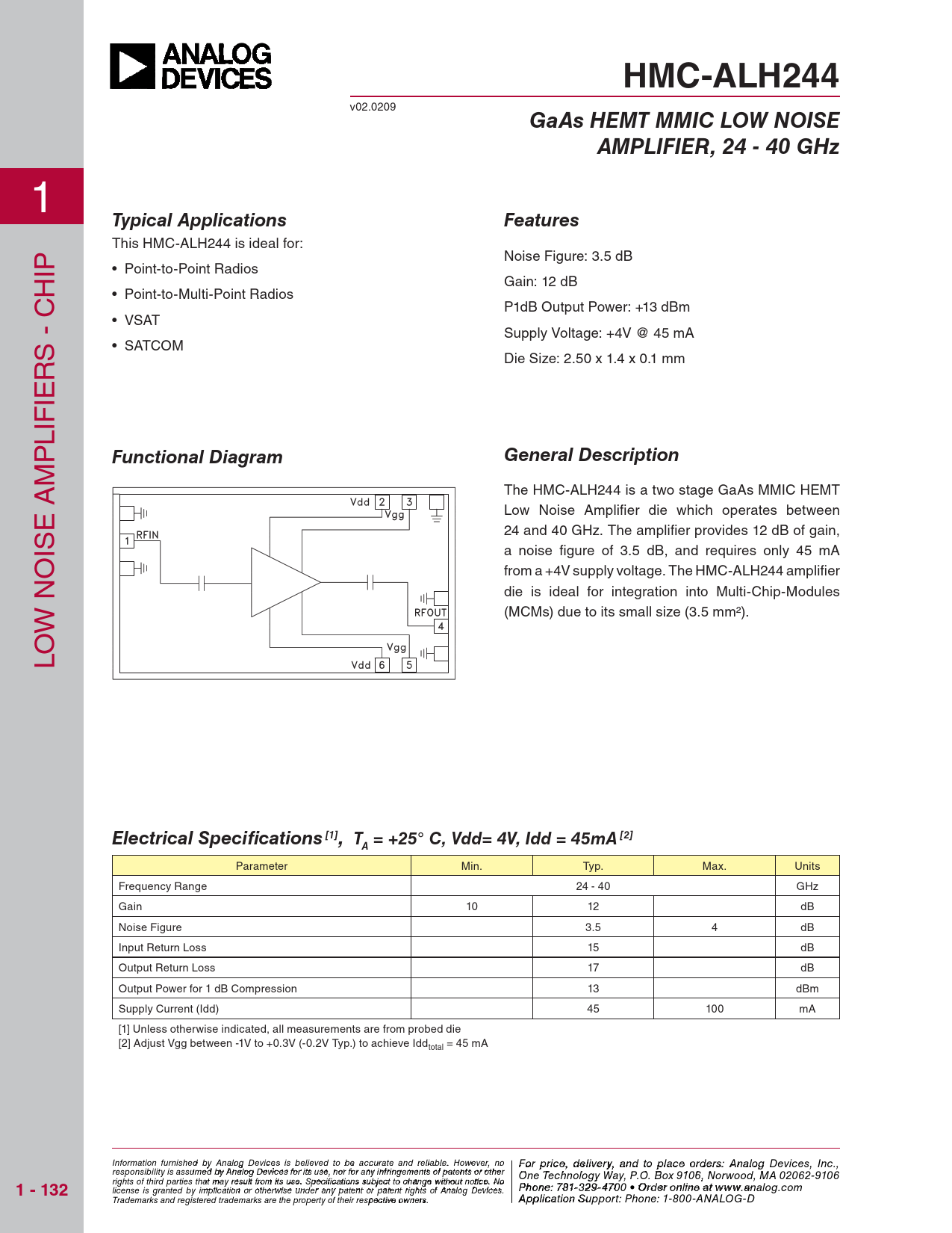 HMC-ALH244 v02.0209 GaAs HEMT MMIC LOW NOISEAMPLIFIER, 24 - 40 GHz 1 Typical ApplicationsFeatures This HMC-ALH244 is ideal for: Noise Figure: 3.5 dB IP • Point-to-Point Radios H Gain: 12 dB • Point-to-Multi-Point Radios C P1dB Output Power: +13 dBm • VSAT - Supply Voltage: +4V @ 45 mA • SATCOM Die Size: 2.50 x 1.4 x 0.1 mm RS IE IF L P Functional DiagramGeneral Description M The HMC-ALH244 is a two stage GaAs MMIC HEMT A Low Noise Amplifi er die which operates between E 24 and 40 GHz. The amplifi er provides 12 dB of gain, IS a noise fi gure of 3.5 dB, and requires only 45 mA O from a +4V supply voltage. The HMC-ALH244 amplifi er N die is ideal for integration into Multi-Chip-Modules (MCMs) due to its small size (3.5 mm2). W O L Electrical Specifi cations [1], T = +25° C, Vdd= 4V, Idd = 45mA [2]A Parameter Min. Typ. Max. Units Frequency Range 24 - 40 GHz Gain 10 12 dB Noise Figure 3.5 4 dB Input Return Loss 15 dB Output Return Loss 17 dB Output Power for 1 dB Compression 13 dBm Supply Current (Idd) 45 100 mA [1] Unless otherwise indicated, all measurements are from probed die [2] Adjust Vgg between -1V to +0.3V (-0.2V Typ.) to achieve Idd = 45 mA total Information furnish F ed obr pri y Anal ce, de og Device li s vie s r beyli, a eve nd to pla d to be accura ce o te and rder reliabl s e , pl . Ho ease co wever, no For price, delivery, and to place orders: Analog Devices, Inc., responsibility is assumed by Analog Devices for its use, nor for any infringements of patents or other ntact Hittite Microwave Corporation: One Technology Way, P.O. Box 9106, Norwood, MA 02062-9106 rights of third parties that may result from its use. Specifications subject to change without notice. No 1 - 132 20 Alpha Road, Chelmsford, MA 01824 Phone: 978 Phon - e 25 : 7 0 81--3 32 3 9 4 - 3 F 70 ax 0 • O : 978 rder on -li25 n 0 e a - t 33 ww 73 license is granted by implication or otherwise under any patent or patent rights of Analog Devices. w.analog.com Order On Trademarks and registered trademarks are the property of their respective owners. -line at www.h A it p tpite.co licatio m n Support: Phone: 1-800-ANALOG-D