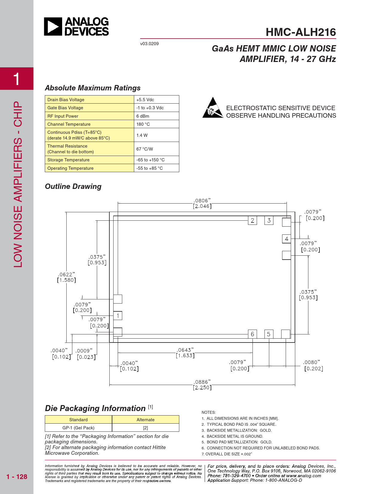 HMC-ALH216. GaAs HEMT MMIC LOW NOISE. AMPLIFIER, 14 - 27 GHz. Absolute Maximum Ratings. Outline Drawing