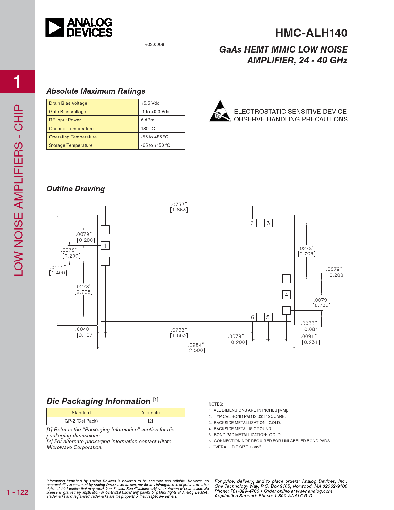 HMC-ALH140. GaAs HEMT MMIC LOW NOISE. AMPLIFIER, 24 - 40 GHz. Absolute Maximum Ratings. Outline Drawing