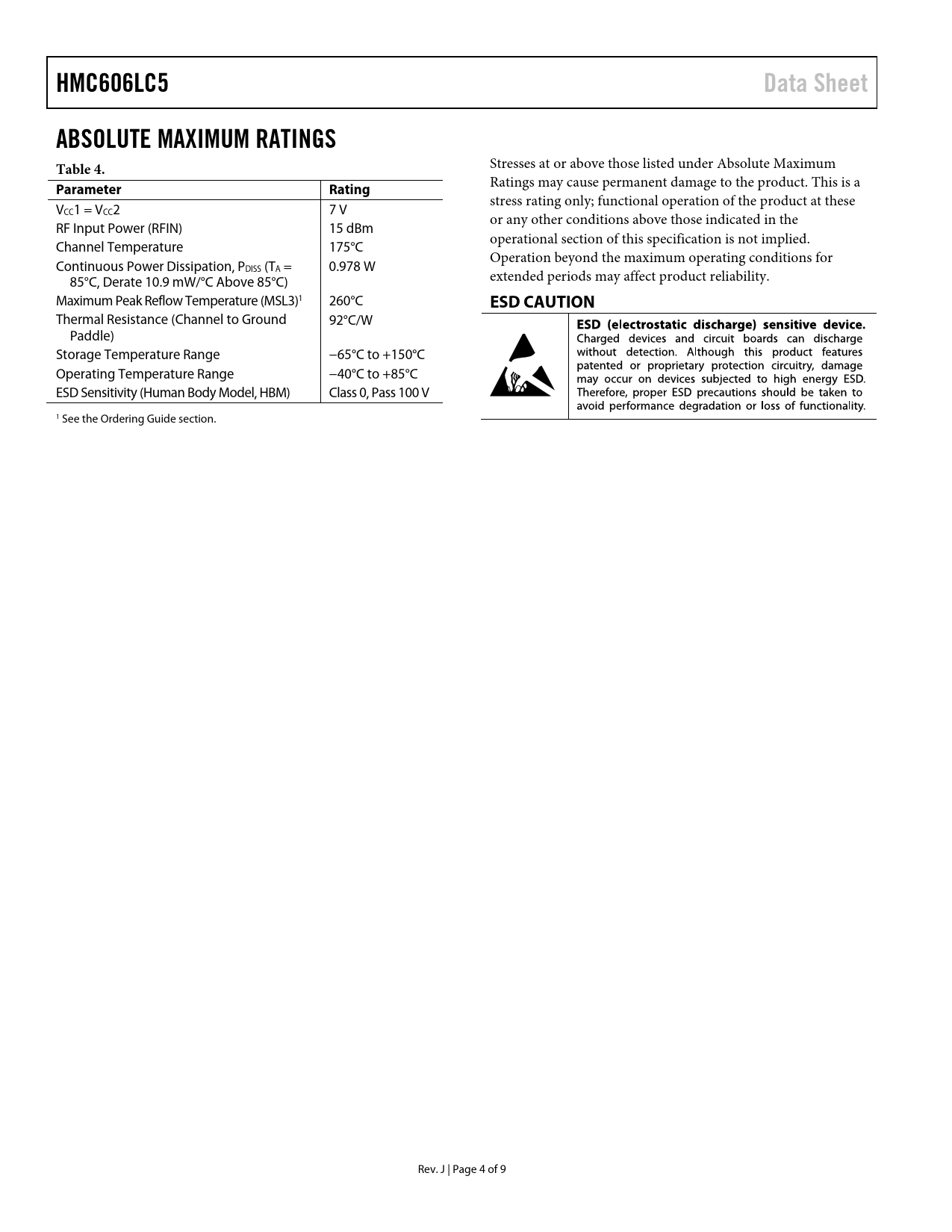 link to page 9 HMC606LC5Data SheetABSOLUTE MAXIMUM RATINGS Table 4. Stresses at or above those listed under Absolute Maximum ParameterRating Ratings may cause permanent damage to the product. This is a stress rating only; functional operation of the product at these VCC1 = VCC2 7 V or any other conditions above those indicated in the RF Input Power (RFIN) 15 dBm operational section of this specification is not implied. Channel Temperature 175°C Operation beyond the maximum operating conditions for Continuous Power Dissipation, PDISS (TA = 0.978 W 85°C, Derate 10.9 mW/°C Above 85°C) extended periods may affect product reliability. Maximum Peak Reflow Temperature (MSL3)1 260°C ESD CAUTION Thermal Resistance (Channel to Ground 92°C/W Paddle) Storage Temperature Range −65°C to +150°C Operating Temperature Range −40°C to +85°C ESD Sensitivity (Human Body Model, HBM) Class 0, Pass 100 V 1 See the Ordering Guide section. Rev. J | Page 4 of 9 Document Outline FEATURES APPLICATIONS FUNCTIONAL BLOCK DIAGRAM GENERAL DESCRIPTION TABLE OF CONTENTS REVISION HISTORY SPECIFICATIONS ELECTRICAL SPECIFICATIONS ABSOLUTE MAXIMUM RATINGS ESD CAUTION PIN CONFIGURATION AND FUNCTION DESCRIPTIONS INTERFACE SCHEMATICS TYPICAL PERFORMANCE CHARACTERISTICS APPLICATIONS INFORMATION EVALUATION PRINTED CIRCUIT BOARD (PCB) OUTLINE DIMENSIONS ORDERING GUIDE