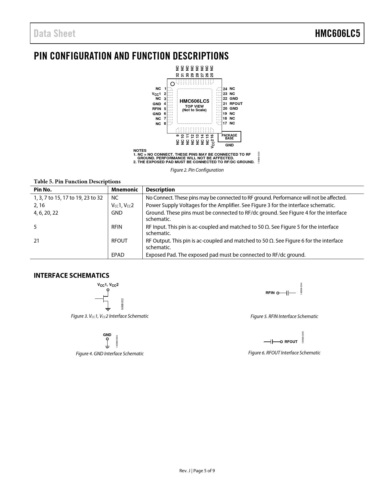 link to page 5 link to page 5 link to page 5 link to page 5 Data SheetHMC606LC5PIN CONFIGURATION AND FUNCTION DESCRIPTIONSNCNCNCNCNCNCNCNC3231302928272625NC 124 NCV2CC123 NCNC 322 GNDHMC606LC5GND 421 RFOUTTOP VIEWRFIN 520 GND(Not to Scale)GND 619 NCNC 718 NCNC 817 NC9PACKAGE10111213141516 2BASENCNCNCNCNCNCNCCCGNDVNOTES 1. NC = NO CONNECT. THESE PINS MAY BE CONNECTED TO RF 020 GROUND. PERFORMANCE WILL NOT BE AFFECTED.2. THE EXPOSED PAD MUST BE CONNECTED TO RF/DC GROUND. 14968- Figure 2. Pin Configuration Table 5. Pin Function Descriptions Pin No.MnemonicDescription 1, 3, 7 to 15, 17 to 19, 23 to 32 NC No Connect. These pins may be connected to RF ground. Performance will not be affected. 2, 16 VCC1, VCC2 Power Supply Voltages for the Amplifier. See Figure 3 for the interface schematic. 4, 6, 20, 22 GND Ground. These pins must be connected to RF/dc ground. See Figure 4 for the interface schematic. 5 RFIN RF Input. This pin is ac-coupled and matched to 50 Ω. See Figure 5 for the interface schematic. 21 RFOUT RF Output. This pin is ac-coupled and matched to 50 Ω. See Figure 6 for the interface schematic. EPAD Exposed Pad. The exposed pad must be connected to RF/dc ground. INTERFACE SCHEMATICSVCC1, VCC2 004 RFIN 14968- 002 14968- Figure 3. VCC1, VCC2 Interface Schematic Figure 5. RFIN Interface Schematic GND 005 003 RFOUT 14968- 14968- Figure 4. GND Interface Schematic Figure 6. RFOUT Interface Schematic Rev. J | Page 5 of 9 Document Outline FEATURES APPLICATIONS FUNCTIONAL BLOCK DIAGRAM GENERAL DESCRIPTION TABLE OF CONTENTS REVISION HISTORY SPECIFICATIONS ELECTRICAL SPECIFICATIONS ABSOLUTE MAXIMUM RATINGS ESD CAUTION PIN CONFIGURATION AND FUNCTION DESCRIPTIONS INTERFACE SCHEMATICS TYPICAL PERFORMANCE CHARACTERISTICS APPLICATIONS INFORMATION EVALUATION PRINTED CIRCUIT BOARD (PCB) OUTLINE DIMENSIONS ORDERING GUIDE