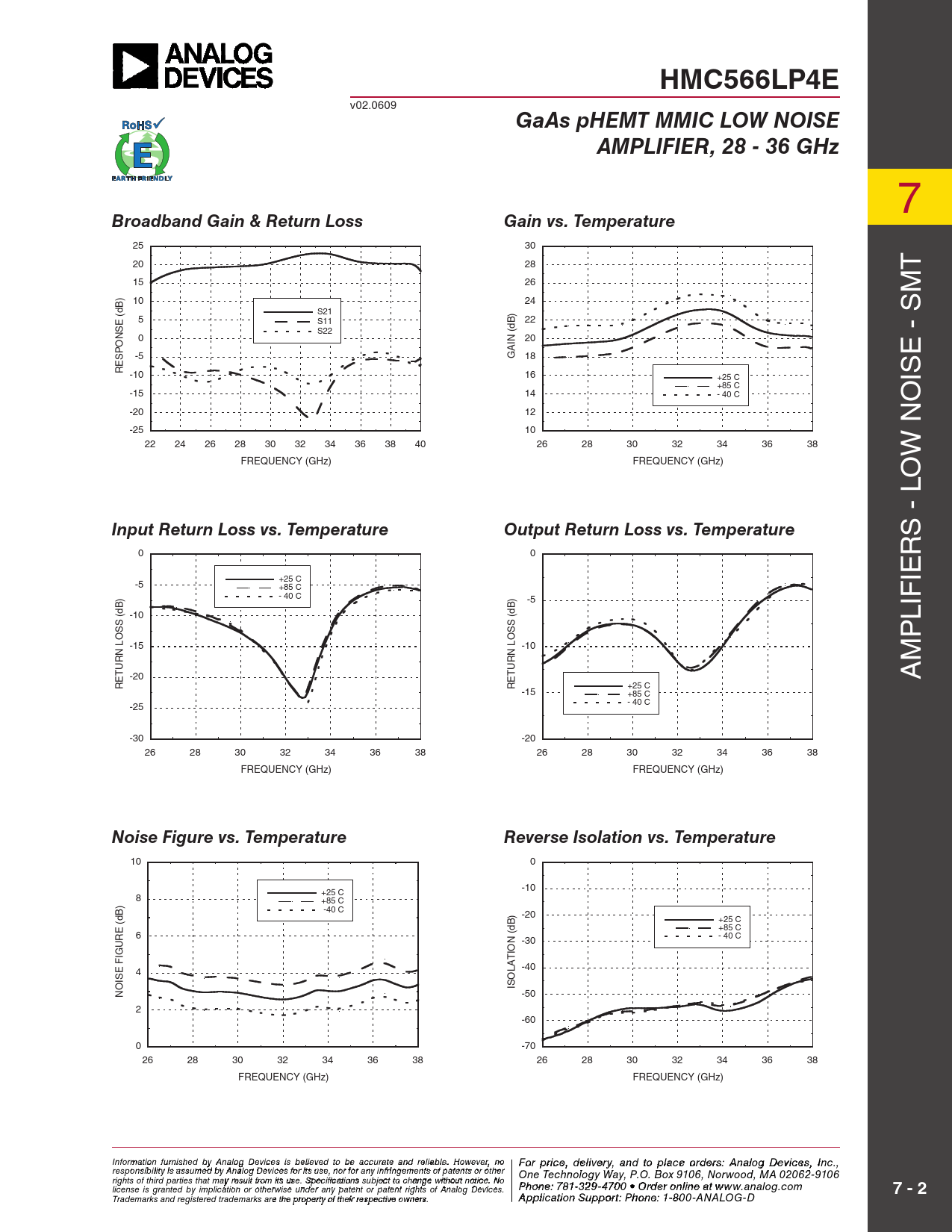 HMC566LP4E v02.0609 GaAs pHEMT MMIC LOW NOISEAMPLIFIER, 28 - 36 GHz 7 Broadband Gain & Return LossGain vs. Temperature 25 30 20 28 T 15 26 m ) 10 24 S21 ) s (dB 5 E S11 22 S S22 N (dB 0 20 O IN P A S -5 G 18 e - E R -10 16 +25 C is +85 C -15 14 - 40 C o -20 12 -25 10 22 24 26 28 30 32 34 36 38 40 26 28 30 32 34 36 38 w N FREQUENCY (GHz) FREQUENCY (GHz) lo Input Return Loss vs. TemperatureOutput Return Loss vs. Temperature s - 0 0 r +25 C ie -5 +85 C - 40 C ) -5 (dB -10 (dB S S lif S S p LO -15 LO -10 N N R R m U U T -20 T E E A R R +25 C -15 +85 C -25 - 40 C -30 -20 26 28 30 32 34 36 38 26 28 30 32 34 36 38 FREQUENCY (GHz) FREQUENCY (GHz) Noise Figure vs. TemperatureReverse Isolation vs. Temperature 10 0 -10 8 +25 C +85 C ) -40 C ) -20 (dB +25 C E +85 C R 6 (dB - 40 C U N -30 IG IO T F E 4 LA -40 IS O O IS N -50 2 -60 0 -70 26 28 30 32 34 36 38 26 28 30 32 34 36 38 FREQUENCY (GHz) FREQUENCY (GHz) Info F rmoatri op n rfiurcne is ,h ed d ebly ivAe n r al y o g aDn evdic eto s i p s bla eli c evee d otro dbe e ras: cc uH ratite tiatne d M reli iac bl reo . w Ho av wev e er , Cno o For price, delivery, and to place orders: Analog Devices, Inc., responsibility is assumed by Analog Devices for its use, nor for any infringements of patents or other rporation, 20 Alpha Road, Chelmsford, MA 01824 One Technology Way, P.O. Box 9106, Norwood, MA 02062-9106 Phone: 978-250-3343 Fax: 978-250-3373 rights of third parties that may result from its use. Specifications subject to change without notice. No O P r h d o e ne r O : 7 n 81- -3li 2n 9 e - 4 a 7 t 0 ww 0 • O w rd .h e it r o tniltie n .c e ao t m license is granted by implication or otherwise under any patent or patent rights of Analog Devices. www.analog.com 7 - 2 Application Support: Pho Trademarks and registered trademarks are the property of their respective owners. ne: 978-250-33 A 4 p 3 p li coarti o ap n S p u s p @ po h rt itt : P ite ho . n c e o : 1m -800-ANALOG-D