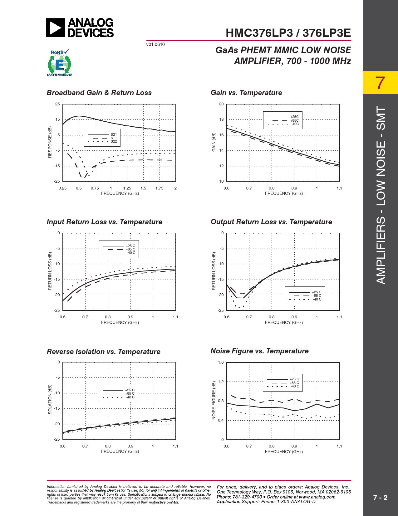 HMC376LP3 / 376LP3E v01.0610 GaAs PHEMT MMIC LOW NOISEAMPLIFIER, 700 - 1000 MHz 7 Broadband Gain & Return LossGain vs. Temperature 25 20 T +25C 15 18 +85C - 40C 5 S21 16 S11 S22 (dB) E - SM -5 GAIN 14 RESPONSE (dB) IS -15 12 -25 10 0.25 0.5 0.75 1 1.25 1.5 1.75 2 0.6 0.7 0.8 0.9 1 1.1 W NO FREQUENCY (GHz) FREQUENCY (GHz) O - L Input Return Loss vs. TemperatureOutput Return Loss vs. Temperature S R 0 0 IE +25 C -5 +85 C -5 -40 C IF L -10 -10 P M -15 -15 A RETURN LOSS (dB) RETURN LOSS (dB) +25 C -20 -20 +85 C -40 C -25 -25 0.6 0.7 0.8 0.9 1 1.1 0.6 0.7 0.8 0.9 1 1.1 FREQUENCY (GHz) FREQUENCY (GHz) Reverse Isolation vs. TemperatureNoise Figure vs. Temperature 0 1.6 -5 +25 C 1.2 +85 C -40 C +25 C -10 +85 C -40 C GURE (dB) 0.8 -15 SE FI ISOLATION (dB) NOI 0.4 -20 -25 0 0.6 0.7 0.8 0.9 1 1.1 0.6 0.7 0.8 0.9 1 1.1 FREQUENCY (GHz) FREQUENCY (GHz) Information furnish F e o d r pri by An ce, de alog Devic leis vie s rby eli, a eve nd to pla d to be accur ce o ate an r d der relia s ble , pl . Ho ease co wever, no For price, delivery, and to place orders: Analog Devices, Inc., responsibility is assumed by Analog Devices for its use, nor for any infringements of patents or other ntact Hittite Microwave Corporation: One Technology Way, P.O. Box 9106, Norwood, MA 02062-9106 20 Alpha Road, Chelmsford, MA 01824 Phone rights of third parties that may result from its use. Specifications subject to change without notice. No : 978 Pho - n 25 e: 7 0- 81 3 3 3 2 4 9- 3 F 470 ax: 978 0 • Order o - n 25 lin 0 e a-t 3373 license is granted by implication or otherwise under any patent or patent rights of Analog Devices. www.analog.com 7 - 2 Order On- Trademarks and registered trademarks are the property of their respective owners. line at www.hi A tptipte.co licatio m n Support: Phone: 1-800-ANALOG-D