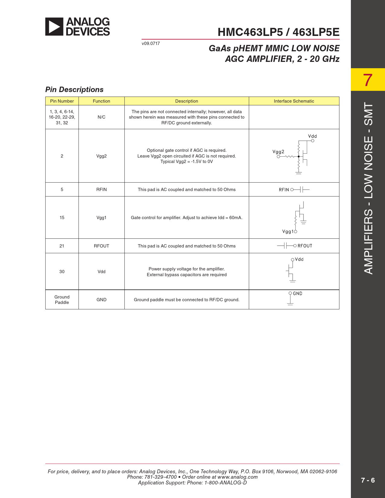 HMC463LP5 / 463LP5E v09.0717 GaAs pHEMT MMIC LOW NOISEAGC AMPLIFIER, 2 - 20 GHz 7 Pin Descriptions Pin Number Function Description Interface Schematic T 1, 3, 4, 6-14, The pins are not connected internally; however, all data 16-20, 22-29, N/C shown herein was measured with these pins connected to M 31, 32 RF/DC ground externally. E - S Optional gate control if AGC is required. IS 2 Vgg2 Leave Vgg2 open circuited if AGC is not required. Typical Vgg2 = -1.5V to 0V O W N 5 RFIN This pad is AC coupled and matched to 50 Ohms O S - L 15 Vgg1 Gate control for amplifier. Adjust to achieve Idd = 60mA. R IE 21 RFOUT This pad is AC coupled and matched to 50 Ohms LIF P M Power supply voltage for the amplifier. 30 Vdd External bypass capacitors are required A Ground GND Ground paddle must be connected to RF/DC ground. Paddle For price, delivery, and to place orders: Analog Devices, Inc., One Technology Way, P.O. Box 9106, Norwood, MA 02062-9106 Phone: 781-329-4700 • Order online at www.analog.com Application Support: Phone: 1-800-ANALOG-D 7 - 6