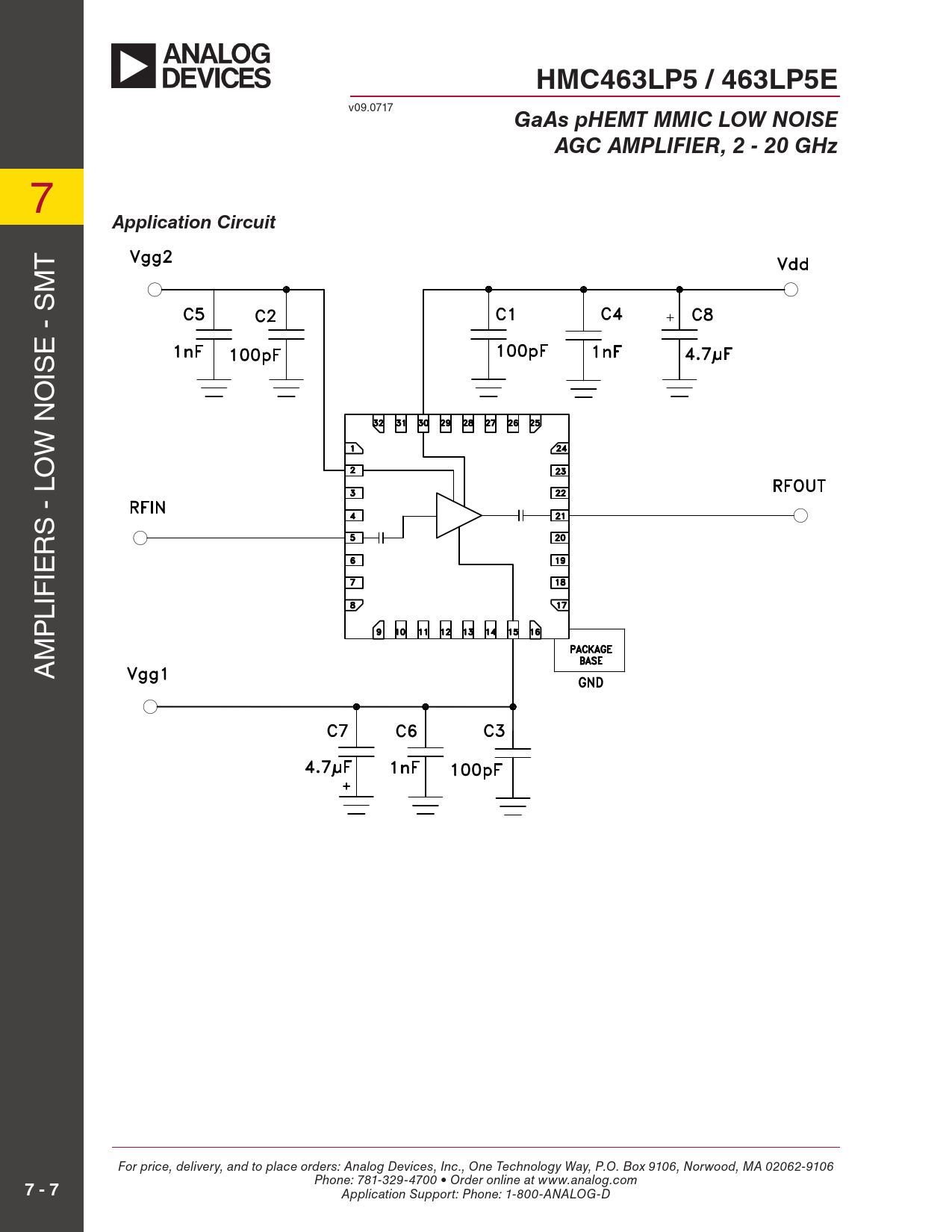 HMC463LP5 / 463LP5E v09.0717 GaAs pHEMT MMIC LOW NOISEAGC AMPLIFIER, 2 - 20 GHz 7 Application Circuit T M E - S IS O W N O S - L R IE LIF P M A For price, delivery, and to place orders: Analog Devices, Inc., One Technology Way, P.O. Box 9106, Norwood, MA 02062-9106 Phone: 781-329-4700 • Order online at www.analog.com 7 - 7 Application Support: Phone: 1-800-ANALOG-D