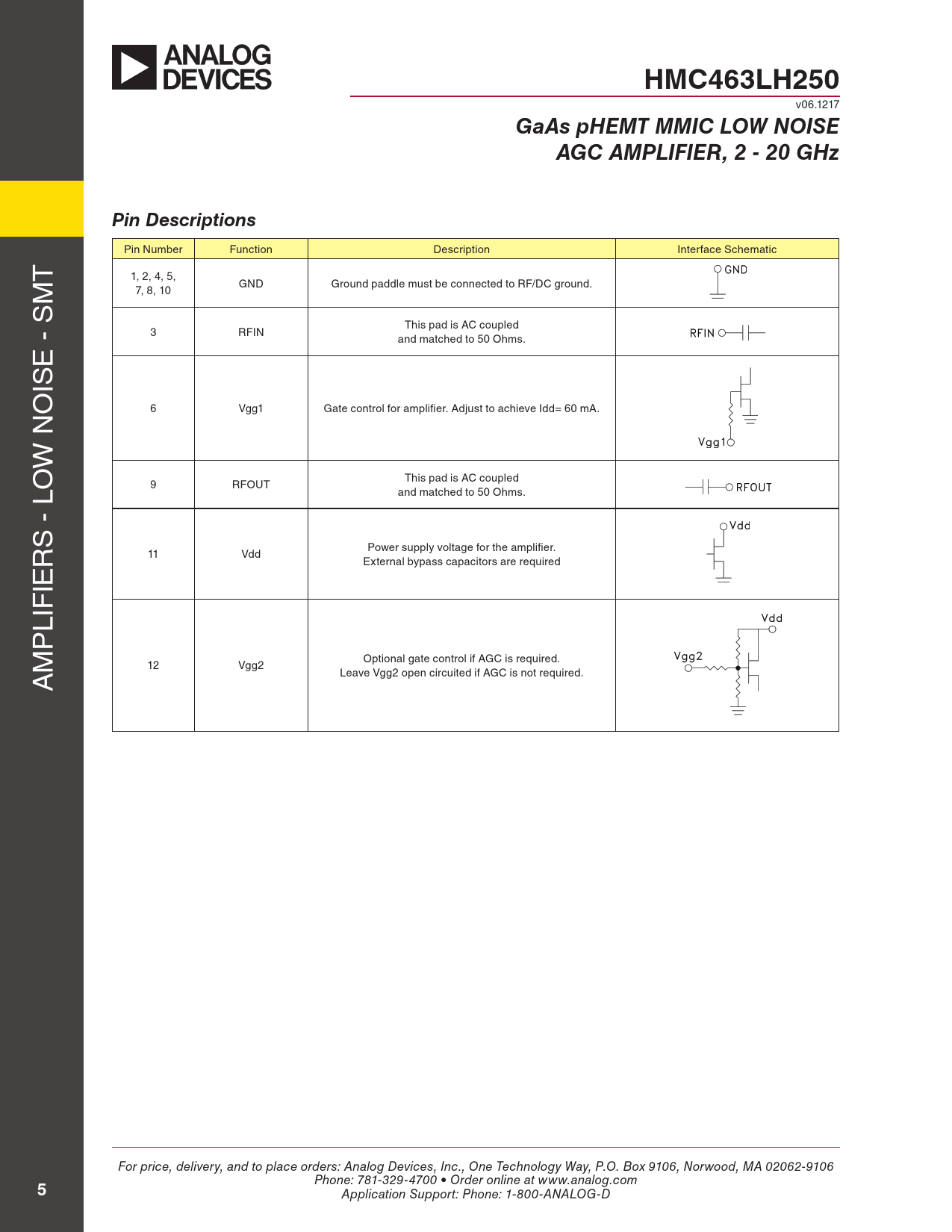 HMC463LH250. GaAs pHEMT MMIC LOW NOISE. AGC AMPLIFIER, 2 - 20 GHz. Pin Descriptions