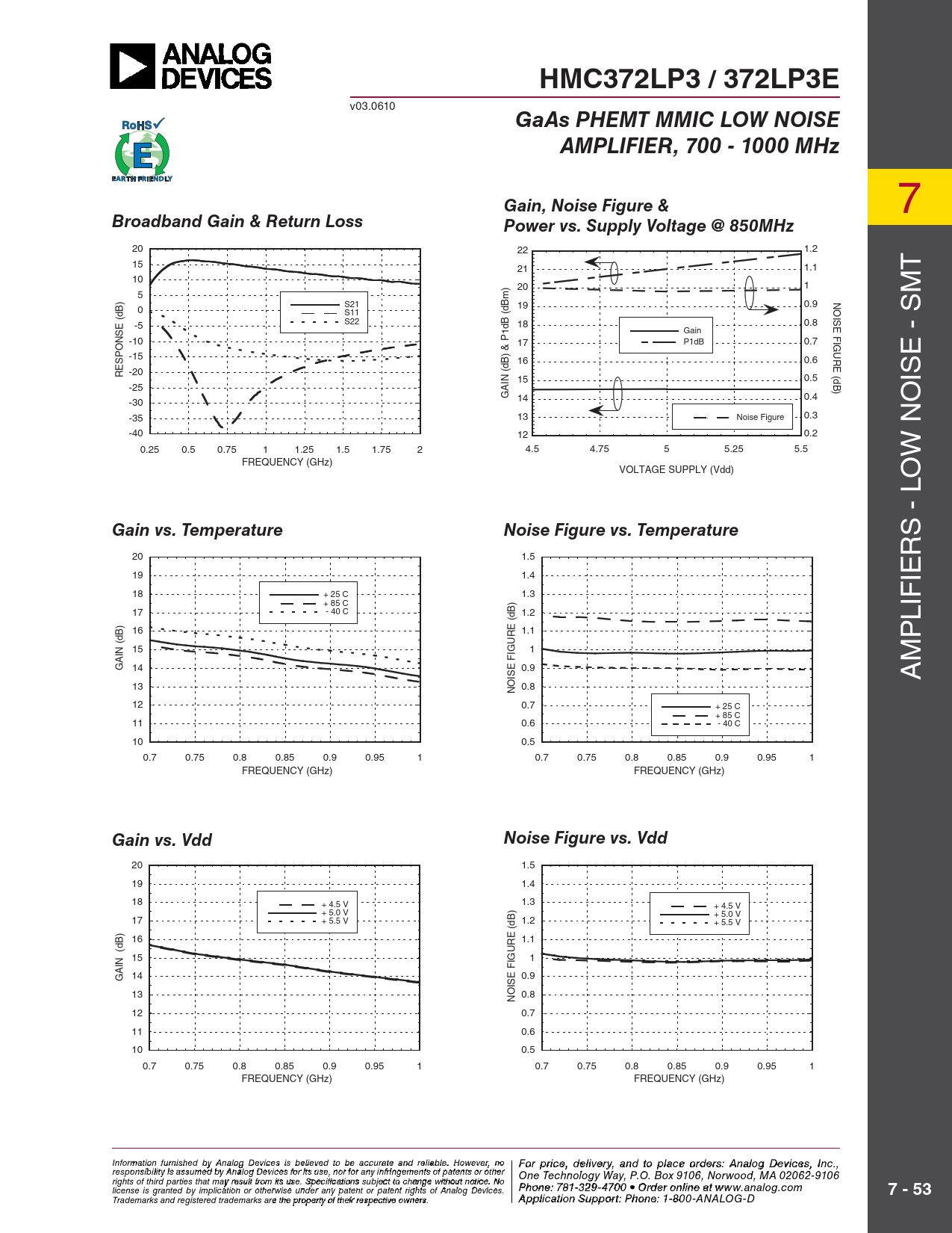 HMC372LP3 / 372LP3E v03.0610 GaAs PHEMT MMIC LOW NOISEAMPLIFIER, 700 - 1000 MHzGain, Noise Figure & 7 Broadband Gain & Return LossPower vs. Supply Voltage @ 850MHz 20 22 1.2 15 21 1.1 T 10 20 1 5 NOISE FIGURE (dB) S21 19 0.9 0 S11 S22 -5 18 0.8 Gain -10 17 P1dB 0.7 -15 E - SM 16 0.6 -20 RESPONSE (dB) 15 0.5 IS -25 GAIN (dB) & P1dB (dBm) 14 0.4 -30 -35 13 Noise Figure 0.3 -40 12 0.2 0.25 0.5 0.75 1 1.25 1.5 1.75 2 4.5 4.75 5 5.25 5.5 W NO FREQUENCY (GHz) VOLTAGE SUPPLY (Vdd) O - L Gain vs. TemperatureNoise Figure vs. Temperature S 20 1.5 R 19 1.4 IE 18 + 25 C 1.3 + 85 C IF 17 - 40 C 1.2 L 16 1.1 P (dB) 15 GURE (dB) 1 M GAIN 14 0.9 SE FI A 13 0.8 NOI 12 0.7 + 25 C + 85 C 11 0.6 - 40 C 10 0.5 0.7 0.75 0.8 0.85 0.9 0.95 1 0.7 0.75 0.8 0.85 0.9 0.95 1 FREQUENCY (GHz) FREQUENCY (GHz) Gain vs. VddNoise Figure vs. Vdd 20 1.5 19 1.4 18 + 4.5 V 1.3 + 4.5 V + 5.0 V + 5.0 V 17 + 5.5 V 1.2 + 5.5 V 16 1.1 (dB) 15 GURE (dB) 1 14 GAIN 0.9 SE FI 13 0.8 NOI 12 0.7 11 0.6 10 0.5 0.7 0.75 0.8 0.85 0.9 0.95 1 0.7 0.75 0.8 0.85 0.9 0.95 1 FREQUENCY (GHz) FREQUENCY (GHz) Info F rmoatr pr ion f iurcne, de ished b ly iv A e n r al y o a g D n evd to p ices is bla eli c eve o ed t rde o be ras: H ccuratite tiatne M d reli iacr ble ow . Ho av wev e C er, n o o rpo Fora r t p iro ic n e ,, 2 d 0 eli A ve lrpha R y, and toad, C o place hoel rd m er s s fo : Ard, MA 01 nalog Devic 8 e 2 s 4 , Inc., responsibility is assumed by Analog Devices for its use, nor for any infringements of patents or other One Technology Way, P.O. Box 9106, Norwood, MA 02062-9106 Phone: 978-250-3343 Fax: 978-250-3373 O rights of third parties that may result from its use. Specifications subject to change without notice. No P rde hone r O : 7 n 81- -3li 2n 9 e a -47 t w 0 w 0 • O w rd .ehit r o t nilte in .c e ao t m license is granted by implication or otherwise under any patent or patent rights of Analog Devices. www.analog.com 7 - 53 Application Support: Pho Trademarks and registered trademarks are the property of their respective owners. ne: 978-250-33 A 4 p 3 o plica r app tion Su s p @ po h rt itt : P ite ho .c ne o : 1m -800-ANALOG-D