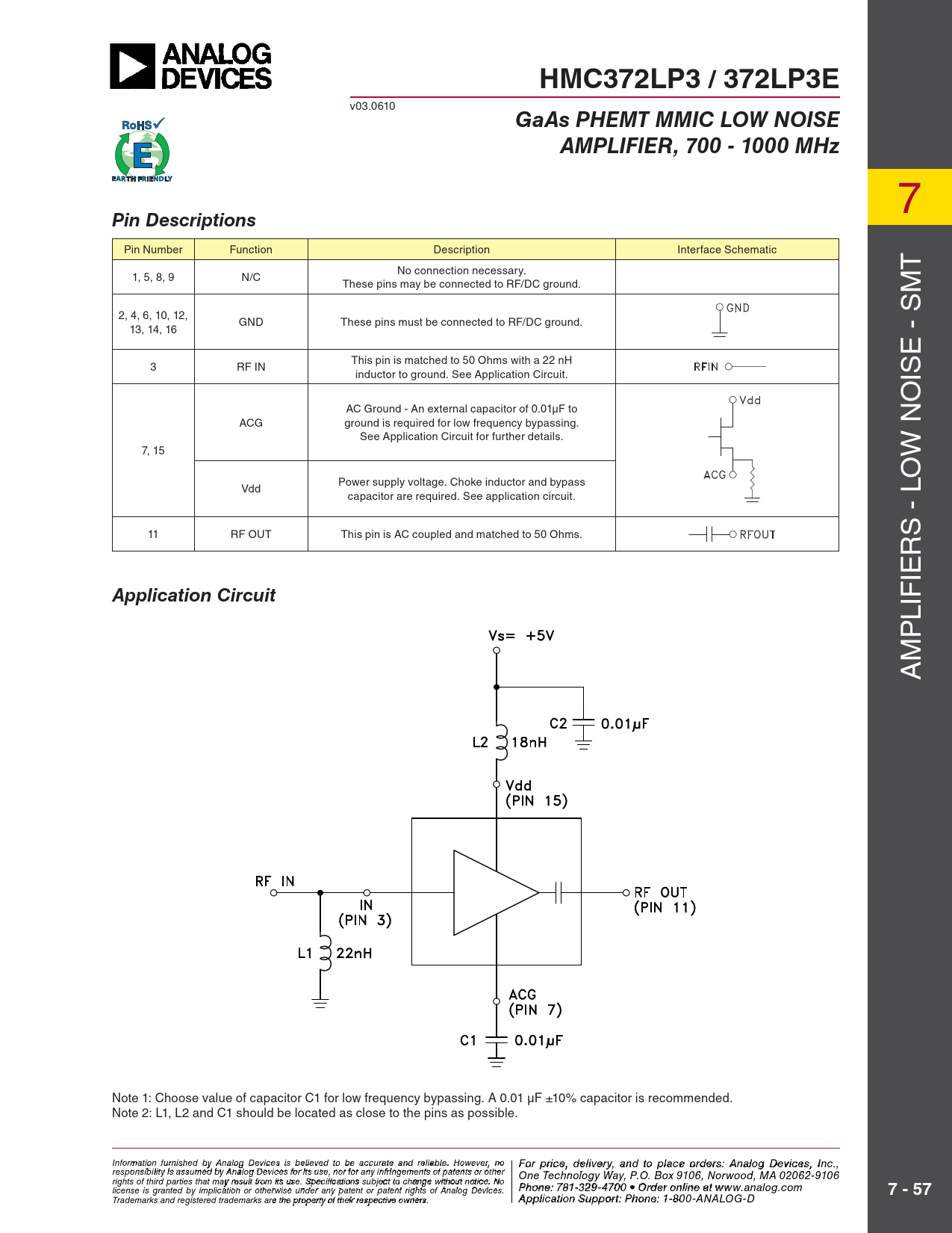HMC372LP3 / 372LP3E. GaAs PHEMT MMIC LOW NOISE. AMPLIFIER, 700 - 1000 MHz. Pin Descriptions. Application Circuit. 7 - 57