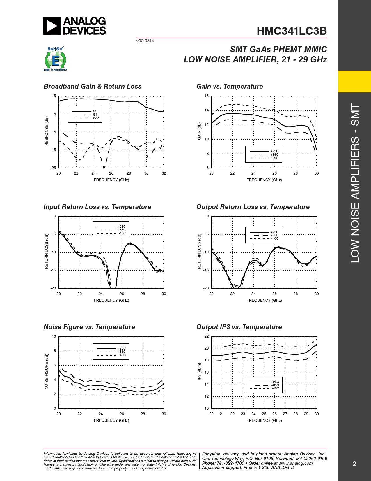 HMC341LC3B v03.0514 SMT GaAs PHEMT MMICLOW NOISE AMPLIFIER, 21 - 29 GHzBroadband Gain & Return LossGain vs. Temperature 15 16 S21 14 T 5 S11 S22 M (dB) 12 (dB) -5 GAIN 10 S - S RESPONSE -15 +25C R 8 +85C -40C IE -25 6 20 22 24 26 28 30 32 20 22 24 26 28 30 LIF FREQUENCY (GHz) FREQUENCY (GHz) P M Input Return Loss vs. TemperatureOutput Return Loss vs. Temperature E A 0 0 IS +25C O +85C -5 -40C -5 +25C +85C -40C (dB) (dB) W N LOSS LOSS -10 -10 LO RETURN RETURN -15 -15 -20 -20 20 22 24 26 28 30 20 22 24 26 28 30 FREQUENCY (GHz) FREQUENCY (GHz) Noise Figure vs. TemperatureOutput IP3 vs. Temperature 10 22 +25C 20 8 +85C ) -40C (dB 18 E ) 6 R U IG (dBm 16 F E 4 IP3 +25C IS 14 O +85C N -40C 2 12 0 10 20 22 24 26 28 30 20 21 22 23 24 25 26 27 28 29 30 FREQUENCY (GHz) FREQUENCY (GHz) Inf F or o m r p atio r n ifc ur e n , d ishe e d lbiv y e A r n y a alog n D d t evic o p es is la beclie o eved rd to ebre sa: H ccur iattti e tae M nd re ilicarbloew . H a o ve C wever, o n rp o For price, delivery, and to place orders: Analog Devices, Inc., responsibility is assumed by Analog Devices for its use, nor for any infringements of patents or other oration, 2 Elizabeth Drive, Chelmsford, MA 01824 One Technology Way, P.O. Box 9106, Norwood, MA 02062-9106 Phone: 978-250-3343 Fax: 978-250-3373 O rights of third parties that may result from its use. Specifications subject to change without notice. No P rd hone e r O : 7 n 81- -3li 2n 9 e a -47 t w 0 w 0 • O w rd .h e it r o t niltie n .c e ao t m license is granted by implication or otherwise under any patent or patent rights of Analog Devices. www.analog.com 2 Application Support: Pho Trademarks and registered trademarks are the property of their respective owners. ne: 978-250-33 A 4 p 3 o plica r a tio p n S p u s p @ po h rt itt : P ite ho . n c e o : 1m -800-ANALOG-D