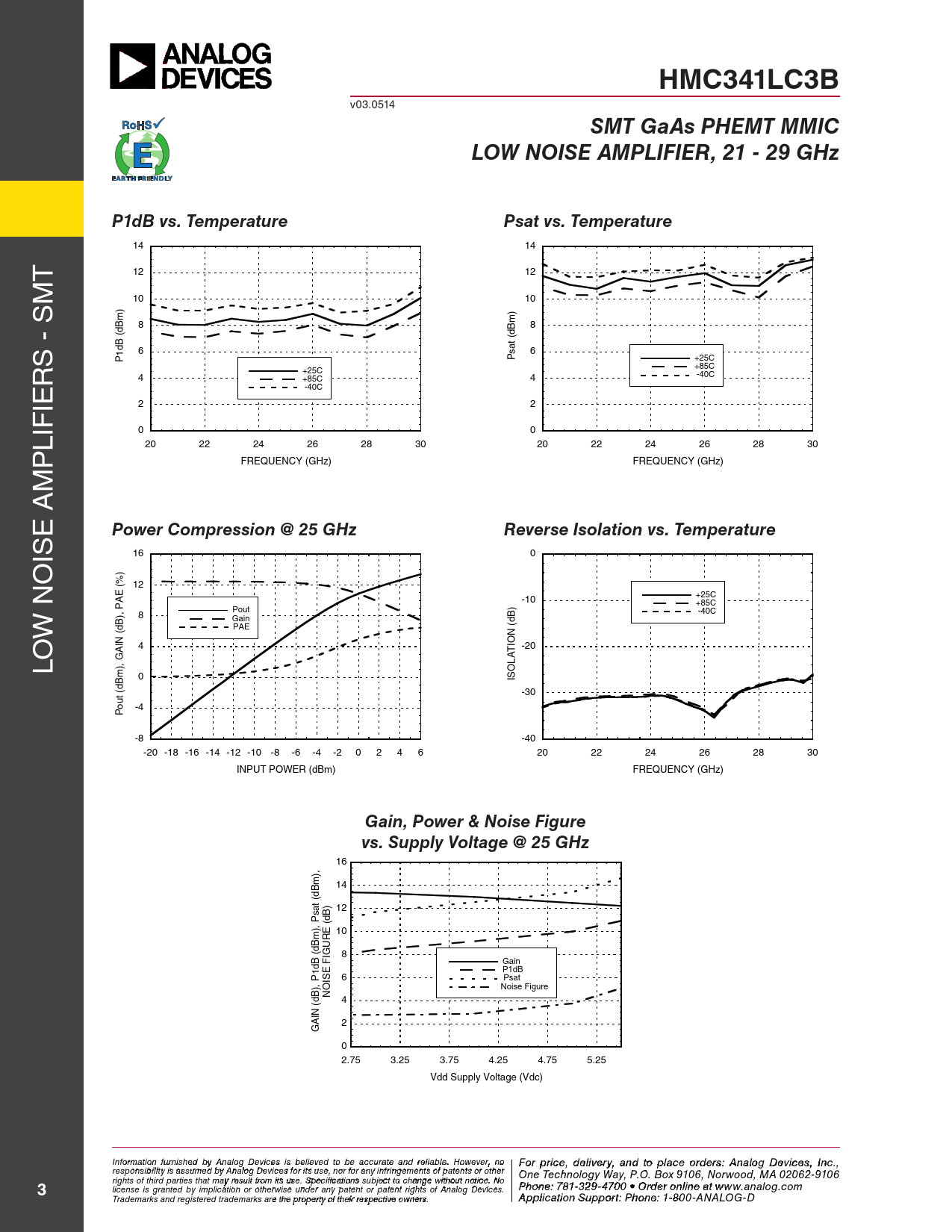 HMC341LC3B v03.0514 SMT GaAs PHEMT MMICLOW NOISE AMPLIFIER, 21 - 29 GHzP1dB vs. TemperaturePsat vs. Temperature 14 14 T 12 12 M 10 10 8 8 (dBm) (dBm) S - S 6 6 P1dB Psat +25C R +25C +85C 4 +85C 4 -40C IE -40C 2 2 LIF 0 0 P 20 22 24 26 28 30 20 22 24 26 28 30 FREQUENCY (GHz) FREQUENCY (GHz) M E A Power Compression @ 25 GHzReverse Isolation vs. Temperature IS 16 0 O (%) 12 -10 +25C +85C PAE ) Pout -40C W N 8 Gain PAE (dB (dB), N IO 4 -20 T LO GAIN LA O 0 IS (dBm), -30 -4 Pout -8 -40 -20 -18 -16 -14 -12 -10 -8 -6 -4 -2 0 2 4 6 20 22 24 26 28 30 INPUT POWER (dBm) FREQUENCY (GHz) Gain, Power & Noise Figurevs. Supply Voltage @ 25 GHz 16 14 (dBm), ) 12 Psat (dBE 10 Bm), RU (d IG 8 F Gain E P1dB P1dB 6 IS Psat O Noise Figure N 4 (dB), 2 GAIN 0 2.75 3.25 3.75 4.25 4.75 5.25 Vdd Supply Voltage (Vdc) Inf F or o m r p atio r n ifc ur e n , d ishe e d lbiv y e A r n y a alog n D d t evic o p es is la beclie o eved rd to ebre sa: H ccur iattti e tae M nd re ilicarbloew . H a o ve C wever, o n rp o For price, delivery, and to place orders: Analog Devices, Inc., responsibility is assumed by Analog Devices for its use, nor for any infringements of patents or other oration, 2 Elizabeth Drive, Chelmsford, MA 01824 One Technology Way, P.O. Box 9106, Norwood, MA 02062-9106 Phone: 978-250-3343 Fax: 978-250-3373 O rights of third parties that may result from its use. Specifications subject to change without notice. No P rd hone e r O : 7 n 81- -3li 2n 9 e a -47 t w 0 w 0 • O w rd .h e it r o t niltie n .c e ao t m 3 license is granted by implication or otherwise under any patent or patent rights of Analog Devices. www.analog.com Application Support: Pho Trademarks and registered trademarks are the property of their respective owners. ne: 978-250-33 A 4 p 3 o plica r a tio p n S p u s p @ po h rt itt : P ite ho . n c e o : 1m -800-ANALOG-D