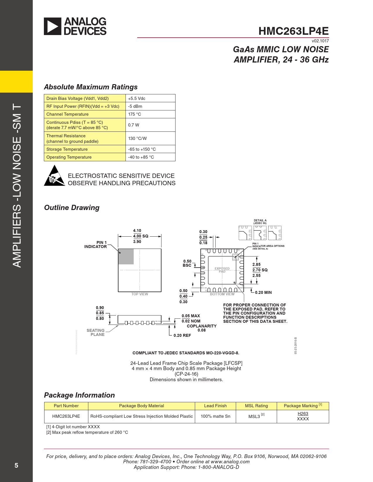 HMC263LP4E v02.1017 GaAs MMIC LOW NOISEAMPLIFIER, 24 - 36 GHzAbsolute Maximum Ratings Drain Bias Voltage (Vdd1, Vdd2) +5.5 Vdc T rf input power (rfiN)(Vdd = +3 Vdc) -5 dBm m Channel Temperature 175 °C s Continuous pdiss (T = 85 °C) 0.7 w (derate 7.7 mw/°C above 85 °C) e - Thermal resistance 130 °C/w (channel to ground paddle) is storage Temperature -65 to +150 °C o operating Temperature -40 to +85 °C w N eleCTrosTATiC seNsiTiVe DeViCe oBserVe HANDliNG preCAUTioNs lo 24-Lead Lead Frame Chip Scale Package [LFCSP] s - 4 x 4 mm Body and 0.85 mm Package HeightOutline Drawing(CP-24-16) r Dimensions shown in millimeters ie DETAIL A(JEDEC 95)4.100.30 lif 4.00 SQ0.25 p PIN 13.900.18PIN 1INDICATORINDICATOR AREA OPTIONS(SEE DETAIL A)1924 m 181 A 0.50BSC2.85EXPOSEDPAD2.70 SQ2.551360.50127TOP VIEW0.20 MIN0.40BOTTOM VIEW0.300.90FOR PROPER CONNECTION OFTHE EXPOSED PAD, REFER TO0.85THE PIN CONFIGURATION AND0.800.05 MAXFUNCTION DESCRIPTIONS0.02 NOMSECTION OF THIS DATA SHEET.COPLANARITYSEATING0.08PLANE0.20 REFPKG-004926/PKG-004942COMPLIANT TO JEDEC STANDARDS MO-220-VGGD-8.05-25-2016-B 24-lead lead frame Chip scale package [lfCsp] 4 mm × 4 mm Body and 0.85 mm package Height (Cp-24-16) Dimensions shown in millimeters. Package Information part Number package Body material lead finish msl rating package marking [1] HmC263lp4e roHs-compliant low stress injection molded plastic 100% matte sn msl3 [2] H263 XXXX [1] 4-Digit lot number XXXX [2] max peak reflow temperature of 260 °C For price, delivery, and to place orders: Analog Devices, Inc., One Technology Way, P.O. Box 9106, Norwood, MA 02062-9106 Phone: 781-329-4700 • Order online at www.analog.com 5 Application Support: Phone: 1-800-ANALOG-D Document Outline Typical Applications Features Functional Diagram General Description Electrical Specifications Output IP3 @ Vdd = +5V Output IP3 @ Vdd = +3V Psat @ Vdd = +5V Psat @ Vdd = +3V Output P1dB @ Vdd = +5V Isolation @ Vdd = +5V Isolation @ Vdd = +3V Noise Figure vs. Temperature @ Vdd = +5V Noise Figure vs. Temperature @ Vdd = +3V Output Return Loss @ Vdd = +5V Output Return Loss @ Vdd = +3V Input Return Loss @ Vdd = +5V Input Return Loss @ Vdd = +3V Gain vs. Temperature @ Vdd = +5V Gain vs. Temperature @ Vdd = +3V Output P1dB @ Vdd = +3V Absolute Maximum Ratings Outline Drawing Package Information Pin Description Application Circuit Evaluation PCB List of Materials