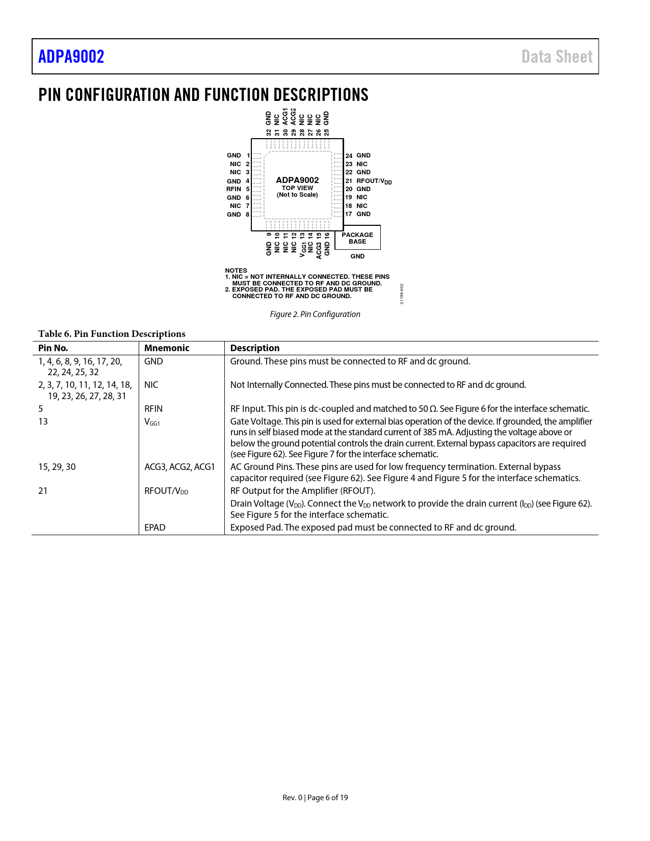 link to page 7 link to page 18 link to page 7 link to page 18 link to page 7 link to page 7 link to page 18 link to page 7 ADPA9002Data SheetPIN CONFIGURATION AND FUNCTION DESCRIPTIONS12CCCCNDNDGNIACGACGNININIG3231302928272625GND 124 GNDNIC 223 NICNIC 322 GNDGND 4ADPA900221 RFOUT/VDDRFIN 5TOP VIEW20 GND(Not to Scale)GND 619 NICNIC 718 NICGND 817 GND910111213141516PACKAGECCCC3BASENDNININININDGGG1VGACGGNDNOTES 1. NIC = NOT INTERNALLY CONNECTED. THESE PINSMUST BE CONNECTED TO RF AND DC GROUND.2. EXPOSED PAD. THE EXPOSED PAD MUST BE 002 CONNECTED TO RF AND DC GROUND. 21196- Figure 2. Pin Configuration Table 6. Pin Function Descriptions Pin No.MnemonicDescription 1, 4, 6, 8, 9, 16, 17, 20, GND Ground. These pins must be connected to RF and dc ground. 22, 24, 25, 32 2, 3, 7, 10, 11, 12, 14, 18, NIC Not Internally Connected. These pins must be connected to RF and dc ground. 19, 23, 26, 27, 28, 31 5 RFIN RF Input. This pin is dc-coupled and matched to 50 Ω. See Figure 6 for the interface schematic. 13 VGG1 Gate Voltage. This pin is used for external bias operation of the device. If grounded, the amplifier runs in self biased mode at the standard current of 385 mA. Adjusting the voltage above or below the ground potential controls the drain current. External bypass capacitors are required (see Figure 62). See Figure 7 for the interface schematic. 15, 29, 30 ACG3, ACG2, ACG1 AC Ground Pins. These pins are used for low frequency termination. External bypass capacitor required (see Figure 62). See Figure 4 and Figure 5 for the interface schematics. 21 RFOUT/VDD RF Output for the Amplifier (RFOUT). Drain Voltage (VDD). Connect the VDD network to provide the drain current (IDD) (see Figure 62). See Figure 5 for the interface schematic. EPAD Exposed Pad. The exposed pad must be connected to RF and dc ground. Rev. 0 | Page 6 of 19 Document Outline FEATURES APPLICATIONS FUNCTIONAL BLOCK DIAGRAM GENERAL DESCRIPTION TABLE OF CONTENTS REVISION HISTORY SPECIFICATIONS DC TO 2 GHz 2 GHz TO 5 GHz 5 GHz TO 10 GHz ABSOLUTE MAXIMUM RATINGS THERMAL RESISTANCE ESD CAUTION PIN CONFIGURATION AND FUNCTION DESCRIPTIONS INTERFACE SCHEMATICS TYPICAL PERFORMANCE CHARACTERISTICS CONSTANT IDD OPERATION THEORY OF OPERATION APPLICATIONS INFORMATION TYPICAL APPLICATION CIRCUIT OUTLINE DIMENSIONS ORDERING GUIDE