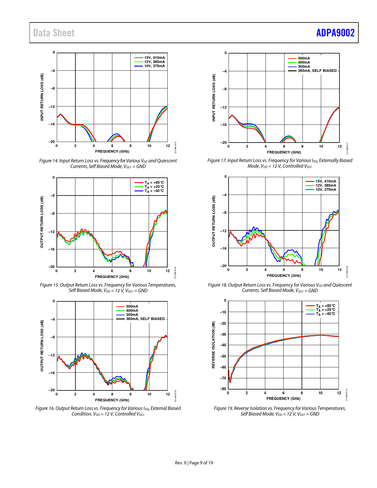 Data SheetADPA90020015V, 410mA500mA12V, 385mA400mA10V, 375mA300mA–4–4385mA, SELF BIASEDB)B)dd((SSSSO–8O–8URN LURN LTT–12RE–12REUTUTINPINP–16–16–20–20024681012 014 024681012 017 FREQUENCY (GHz) 196- 1 196- 2 FREQUENCY (GHz) 1 2 Figure 14. Input Return Loss vs. Frequency for Various VDD and Quiescent Figure 17. Input Return Loss vs. Frequency for Various IDQ, Externally Biased Currents, Self Biased Mode, VGG1 = GND Mode, VDD = 12 V, Controlled VGG1 00T15V, 410mAA = +85°CT12V, 385mAA = +25°CT10V, 375mAA = –40°C–4–4B)B)dd((SSSSOO–8–8URN LURN LTTRE–12RE–12UTUTPPUTUTOO–16–16–20–20 018 024681012 015 024681012 196- FREQUENCY (GHz) 196- 1 1 FREQUENCY (GHz) 2 2 Figure 15. Output Return Loss vs. Frequency for Various Temperatures, Figure 18. Output Return Loss vs. Frequency for Various VDD and Quiescent Self Biased Mode, VDD = 12 V, VGG1 = GND Currents, Self Biased Mode, VGG1 = GND 00500mATA = +85°C400mAT–10A = +25°C300mATA = –40°C–4385mA, SELF BIASEDB))dB–20( S(dSNOIO–30–8T A LURN L–40TSORE–12SE I–50UT PEVERUTR–60O–16–70–20–80 019 024681012 016 024681012 196- FREQUENCY (GHz) 196- 1 1 FREQUENCY (GHz) 2 2 Figure 16. Output Return Loss vs. Frequency for Various IDQ, External Biased Figure 19. Reverse Isolation vs. Frequency for Various Temperatures, Condition, VDD = 12 V, Controlled VGG1 Self Biased Mode, VDD = 12 V, VGG1 = GND Rev. 0 | Page 9 of 19 Document Outline FEATURES APPLICATIONS FUNCTIONAL BLOCK DIAGRAM GENERAL DESCRIPTION TABLE OF CONTENTS REVISION HISTORY SPECIFICATIONS DC TO 2 GHz 2 GHz TO 5 GHz 5 GHz TO 10 GHz ABSOLUTE MAXIMUM RATINGS THERMAL RESISTANCE ESD CAUTION PIN CONFIGURATION AND FUNCTION DESCRIPTIONS INTERFACE SCHEMATICS TYPICAL PERFORMANCE CHARACTERISTICS CONSTANT IDD OPERATION THEORY OF OPERATION APPLICATIONS INFORMATION TYPICAL APPLICATION CIRCUIT OUTLINE DIMENSIONS ORDERING GUIDE