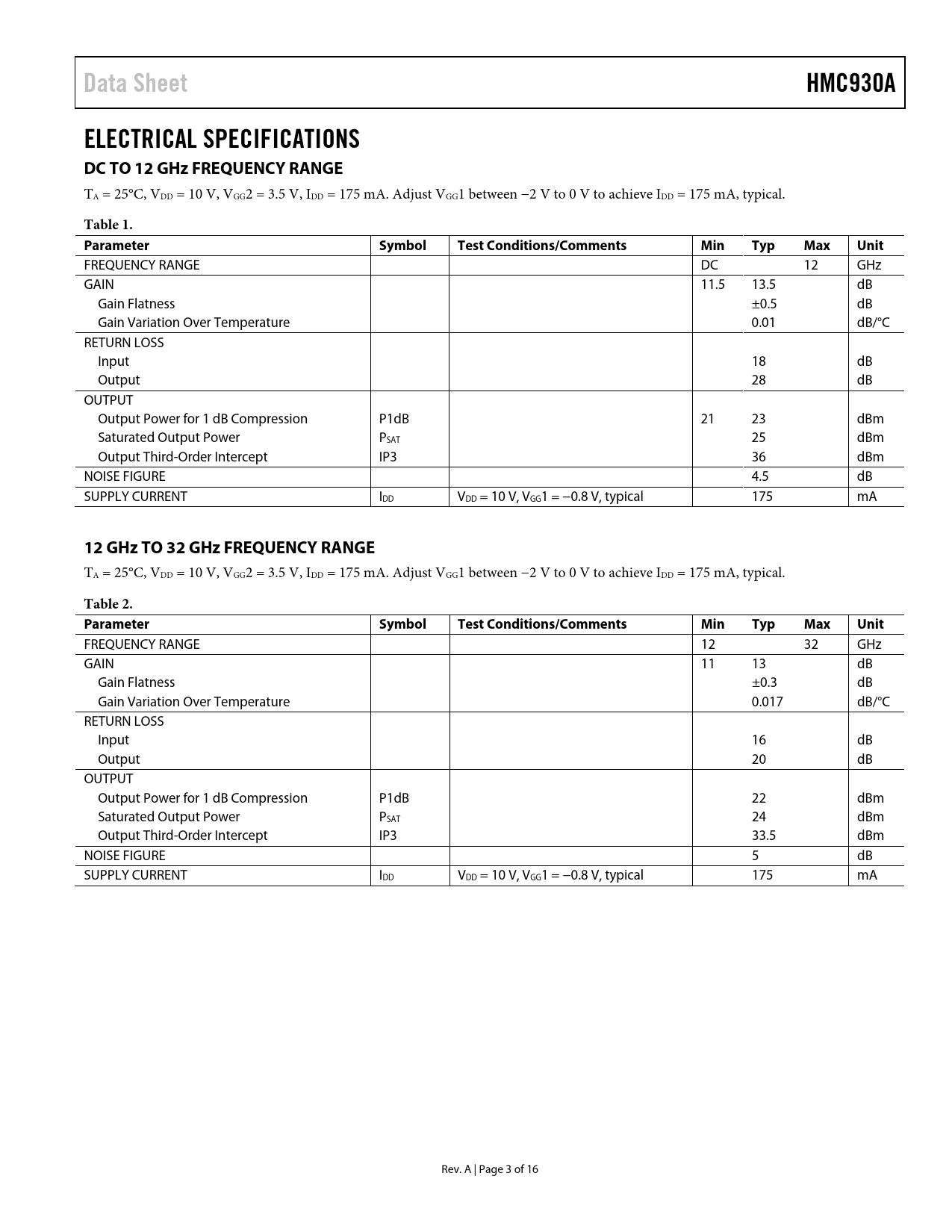 Data Sheet. HMC930A. ELECTRICAL SPECIFICATIONS DC TO 12 GHz FREQUENCY RANGE. Table 1. Parameter. Symbol. Test Conditions/Comments