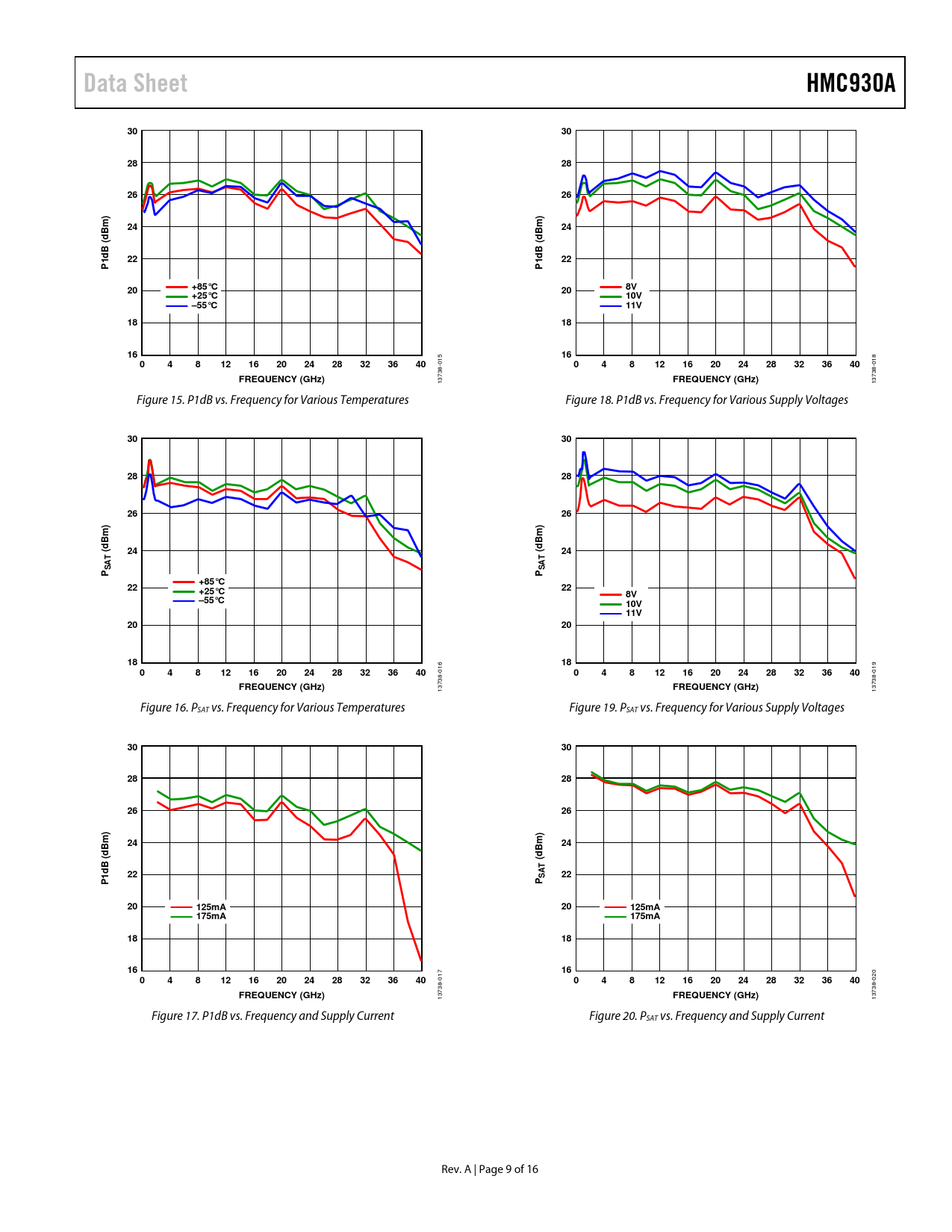 Data SheetHMC930A30302828262624Bm)24Bm)ddB (B (1d221d22PP20+85°C208V+25°C10V–55°C11V181816160481216202428323640 015 0481216202428323640 018 FREQUENCY (GHz) 13738- FREQUENCY (GHz) 13738- Figure 15. P1dB vs. Frequency for Various Temperatures Figure 18. P1dB vs. Frequency for Various Supply Voltages 303028282626Bm)Bm)dd(24(24ATATSSPP+85°C22+25°C228V–55°C10V 11V202018180481216202428323640 016 0481216202428323640 019 FREQUENCY (GHz) 13738- FREQUENCY (GHz) 13738- Figure 16. PSAT vs. Frequency for Various Temperatures Figure 19. PSAT vs. Frequency for Various Supply Voltages 30302828262624Bm)24Bm)dd (B (AT1d22S22PP20125mA20125mA175mA175mA181816160481216202428323640 017 0481216202428323640 020 FREQUENCY (GHz) 13738- FREQUENCY (GHz) 13738- Figure 17. P1dB vs. Frequency and Supply Current Figure 20. PSAT vs. Frequency and Supply Current Rev. A | Page 9 of 16 Document Outline Features Applications Functional Block Diagram General Description Revision History Electrical Specifications DC to 12 GHz Frequency Range 12 GHz to 32 GHz Frequency Range 32 GHz to 40 GHz Frequency Range Total Supply Current by VDD Absolute Maximum Ratings ESD Caution Pin Configuration and Function Descriptions Interface Schematics Typical Performance Characteristics Theory of Operation Applications Information Biasing Procedures Mounting and Bonding Techniques for Millimeterwave GaAs MMICs Handling Precautions Mounting Wire Bonding Outline Dimensions Die Packaging Information Ordering Guide