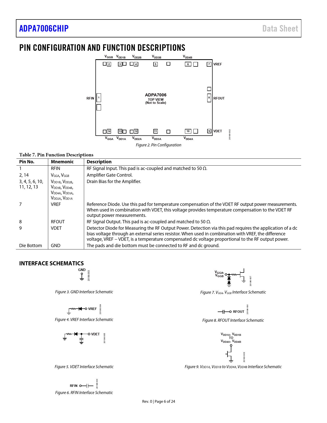 ADPA7006CHIPData SheetPIN CONFIGURATION AND FUNCTION DESCRIPTIONSVGGB VVVVDD1BDD2BDD3BDD4B234567VREFADPA7006RFIN18RFOUTTOP VIEW(Not to Scale)14131211109VDET -002 186 VVVVGGADD1ADD2ADD3AVDD4A 20 Figure 2. Pin Configuration Table 7. Pin Function Descriptions Pin No.MnemonicDescription 1 RFIN RF Signal Input. This pad is ac-coupled and matched to 50 Ω. 2, 14 VGGA, VGGB Amplifier Gate Control. 3, 4, 5, 6, 10, VDD1B, VDD2B, Drain Bias for the Amplifier. 11, 12, 13 VDD3B, VDD4B, VDD4A, VDD3A, VDD2A, VDD1A 7 VREF Reference Diode. Use this pad for temperature compensation of the VDET RF output power measurements. When used in combination with VDET, this voltage provides temperature compensation to the VDET RF output power measurements. 8 RFOUT RF Signal Output. This pad is ac-coupled and matched to 50 Ω. 9 VDET Detector Diode for Measuring the RF Output Power. Detection via this pad requires the application of a dc bias voltage through an external series resistor. When used in combination with VREF, the difference voltage, VREF − VDET, is a temperature compensated dc voltage proportional to the RF output power. Die Bottom GND The pads and die bottom must be connected to RF and dc ground. INTERFACE SCHEMATICSGND 3 V 00 GGA,V 86- GGB 01 007 2 186- 20 Figure 3. GND Interface Schematic Figure 7. VGGA, VGGB Interface Schematic 8 04 VREF 0 00 186- RFOUT 0186- 20 2 Figure 4. VREF Interface Schematic Figure 8. RFOUT Interface Schematic VDETVDD1A, VDD1B 005 TOV 20186- DD4A, VDD4B 9 00 6- 018 2 Figure 5. VDET Interface Schematic Figure 9. VDD1A, VDD1B to VDD4A, VDD4B Interface Schematic 6 00 RFIN 20186- Figure 6. RFIN Interface Schematic Rev. 0 | Page 6 of 24 Document Outline FEATURES APPLICATIONS FUNCTIONAL BLOCK DIAGRAM GENERAL DESCRIPTION TABLE OF CONTENTS REVISION HISTORY SPECIFICATIONS 18 GHz TO 20 GHz FREQUENCY RANGE 20 GHz TO 28 GHz FREQUENCY RANGE 28 GHz TO 36 GHz FREQUENCY RANGE 36 GHz TO 44 GHz FREQUENCY RANGE ABSOLUTE MAXIMUM RATINGS ESD CAUTION PIN CONFIGURATION AND FUNCTION DESCRIPTIONS INTERFACE SCHEMATICS TYPICAL PERFORMANCE CHARACTERISTIC CONSTANT DRAIN CURRENT (IDD) OPERATION THEORY OF OPERATION APPLICATIONS INFORMATION MOUNTING AND BONDING TECHNIQUES FOR MILLIMETERWAVE GaAs MMICS Handling Precautions Mounting Wire Bonding BIASING THE ADPA7006CHIP WITH THE HMC980LP4E APPLICATION CIRCUIT SETUP LIMITING VGATE FOR THE ADPA7006CHIP VGGx AMR (ABSOLUTE MAXIMUM RATING) REQUIREMENT HMC980LP4E BIAS SEQUENCE Power-Up Sequence Power-Down Sequence CONSTANT DRAIN CURRENT BIASING vs. CONSTANT GATE VOLTAGE BIASING TYPICAL APPLICATION CIRCUIT ASSEMBLY DIAGRAMS OUTLINE DIMENSIONS ORDERING GUIDE