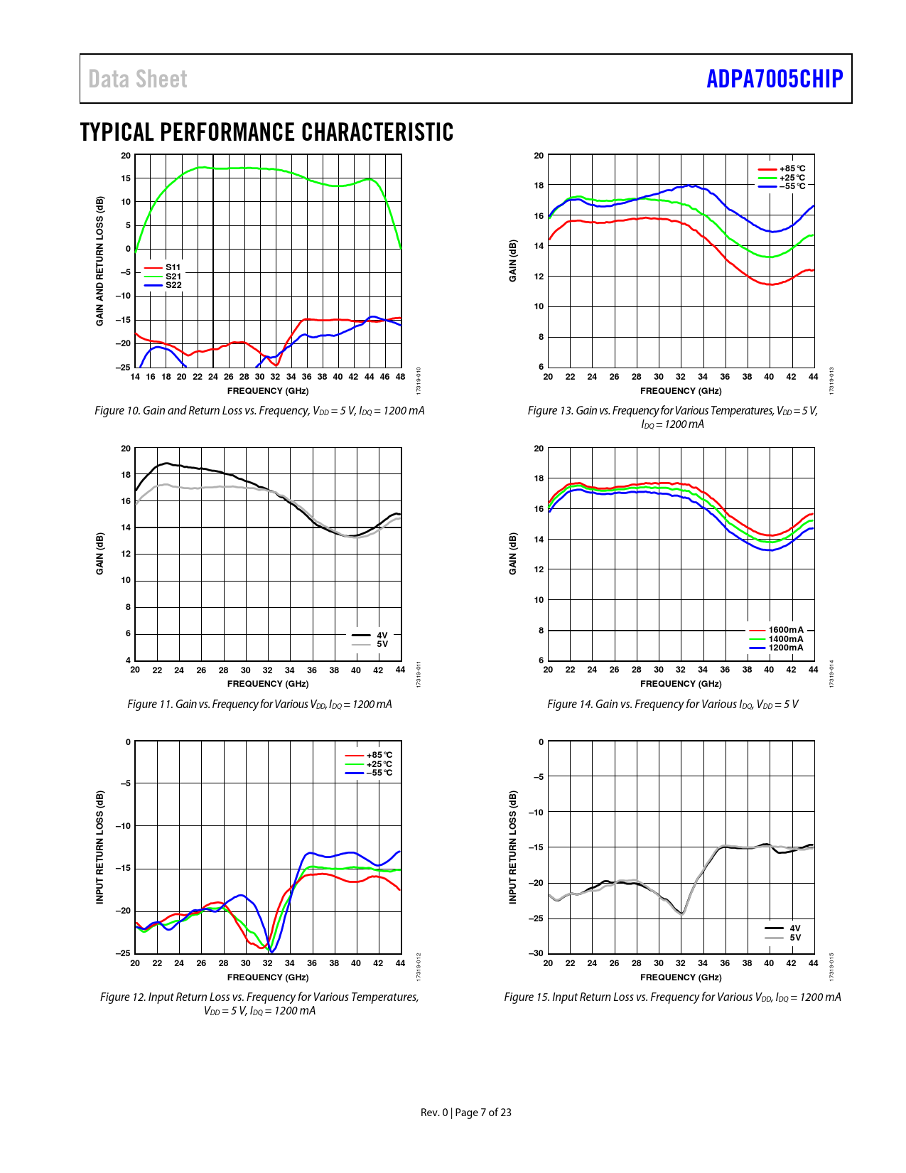 Data Sheet ADPA7005CHIP TYPICAL PERFORMANCE CHARACTERISTIC +85°C +25°C –55°C d ( S URN L T S11 N ( S21 AI G S22 –10 N AND RE –15 –20 –25