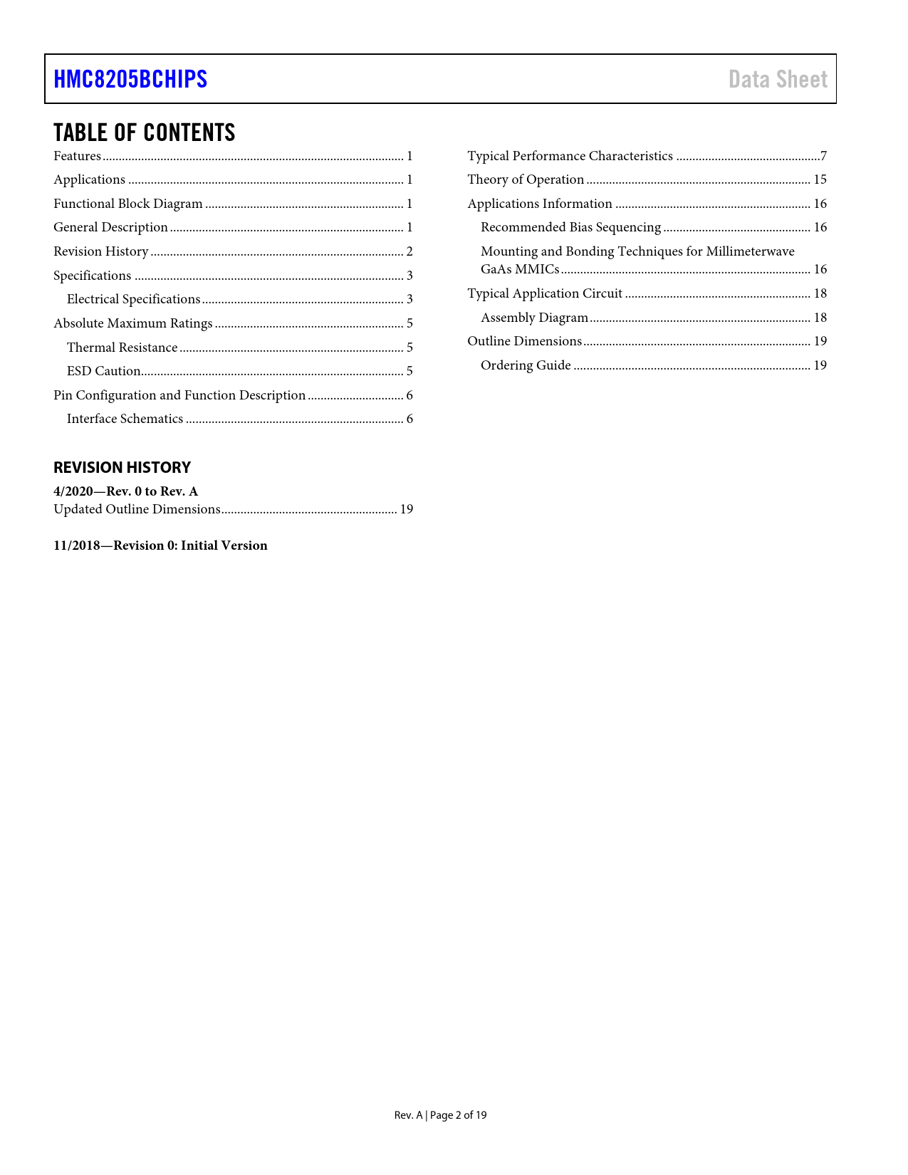 link to page 1 link to page 1 link to page 1 link to page 1 link to page 2 link to page 3 link to page 3 link to page 5 link to page 5 link to page 5 link to page 6 link to page 6 link to page 7 link to page 15 link to page 16 link to page 16 link to page 16 link to page 16 link to page 18 link to page 18 link to page 19 link to page 19 HMC8205BCHIPSData SheetTABLE OF CONTENTS Features .. 1 Typical Performance Characteristics ...7 Applications .. 1 Theory of Operation .. 15 Functional Block Diagram .. 1 Applications Information ... 16 General Description ... 1 Recommended Bias Sequencing .. 16 Revision History ... 2 Mounting and Bonding Techniques for Mil imeterwave Specifications .. 3 GaAs MMICs .. 16 Electrical Specifications ... 3 Typical Application Circuit .. 18 Absolute Maximum Ratings ... 5 Assembly Diagram ... 18 Thermal Resistance .. 5 Outline Dimensions ... 19 ESD Caution.. 5 Ordering Guide .. 19 Pin Configuration and Function Description .. 6 Interface Schematics .. 6 REVISION HISTORY 4/2020—Rev. 0 to Rev. A Updated Outline Dimensions ... 19 11/2018—Revision 0: Initial Version Rev. A | Page 2 of 19 Document Outline FEATURES APPLICATIONS FUNCTIONAL BLOCK DIAGRAM GENERAL DESCRIPTION TABLE OF CONTENTS REVISION HISTORY SPECIFICATIONS ELECTRICAL SPECIFICATIONS ABSOLUTE MAXIMUM RATINGS THERMAL RESISTANCE ESD CAUTION PIN CONFIGURATION AND FUNCTION DESCRIPTION INTERFACE SCHEMATICS TYPICAL PERFORMANCE CHARACTERISTICS THEORY OF OPERATION APPLICATIONS INFORMATION RECOMMENDED BIAS SEQUENCING MOUNTING AND BONDING TECHNIQUES FOR MILLIMETERWAVE GaAs MMICS Handling Precautions TYPICAL APPLICATION CIRCUIT ASSEMBLY DIAGRAM OUTLINE DIMENSIONS ORDERING GUIDE