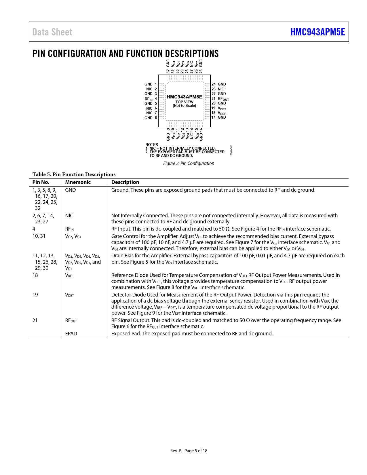 link to page 6 link to page 6 link to page 6 link to page 6 link to page 6 link to page 6 Data SheetHMC943APM5EPIN CONFIGURATION AND FUNCTION DESCRIPTIONSNDCNDG V G1 V D1 V D3 V D5 NI V D7 G 32 31 30 29 28 27 26 25GND 124 GNDNIC 223 NICGND 322 GNDRF4HMC943APM5EIN21 RFOUTGND 5TOP VIEW20 GND(Not to Scale)NIC 619 VDETNIC 718 VREFGND 817 GND9 10 11 12 13 14 15 16CNDNDG V G2 V D2 V D4 V D6 NI V D8 GNOTES 002 1. NIC = NOT INTERNALLY CONNECTED.2. THE EXPOSED PAD MUST BE CONNECTEDTO RF AND DC GROUND. 16864- Figure 2. Pin Configuration Table 5. Pin Function Descriptions Pin No.MnemonicDescription 1, 3, 5, 8, 9, GND Ground. These pins are exposed ground pads that must be connected to RF and dc ground. 16, 17, 20, 22, 24, 25, 32 2, 6, 7, 14, NIC Not Internally Connected. These pins are not connected internally. However, all data is measured with 23, 27 these pins connected to RF and dc ground externally. 4 RFIN RF Input. This pin is dc-coupled and matched to 50 Ω. See Figure 4 for the RFIN interface schematic. 10, 31 VG2, VG1 Gate Control for the Amplifier. Adjust VGx to achieve the recommended bias current. External bypass capacitors of 100 pF, 10 nF, and 4.7 μF are required. See Figure 7 for the VGx interface schematic. VG1 and VG2 are internally connected. Therefore, external bias can be applied to either VG1 or VG2. 11, 12, 13, VD2, VD4, VD6, VD8, Drain Bias for the Amplifier. External bypass capacitors of 100 pF, 0.01 µF, and 4.7 µF are required on each 15, 26, 28, VD7, VD5, VD3, and pin. See Figure 5 for the VDx interface schematic. 29, 30 VD1 18 VREF Reference Diode Used for Temperature Compensation of VDET RF Output Power Measurements. Used in combination with VDET, this voltage provides temperature compensation to VDET RF output power measurements. See Figure 8 for the VREF interface schematic. 19 VDET Detector Diode Used for Measurement of the RF Output Power. Detection via this pin requires the application of a dc bias voltage through the external series resistor. Used in combination with VREF, the difference voltage, VREF − VDET, is a temperature compensated dc voltage proportional to the RF output power. See Figure 9 for the VDET interface schematic. 21 RFOUT RF Signal Output. This pad is dc-coupled and matched to 50 Ω over the operating frequency range. See Figure 6 for the RFOUT interface schematic. EPAD Exposed Pad. The exposed pad must be connected to RF and dc ground. Rev. B | Page 5 of 18 Document Outline FEATURES APPLICATIONS FUNCTIONAL BLOCK DIAGRAM GENERAL DESCRIPTION TABLE OF CONTENTS REVISION HISTORY SPECIFICATIONS ELECTRICAL SPECIFICATIONS ABSOLUTE MAXIMUM RATINGS THERMAL RESISTANCE ESD CAUTION PIN CONFIGURATION AND FUNCTION DESCRIPTIONS INTERFACE SCHEMATICS TYPICAL PERFORMANCE CHARACTERISTICS THEORY OF OPERATION APPLICATIONS INFORMATION POWER DETECTION EVALUATION BOARD EVALUATION BOARD SCHEMATIC OUTLINE DIMENSIONS ORDERING GUIDE