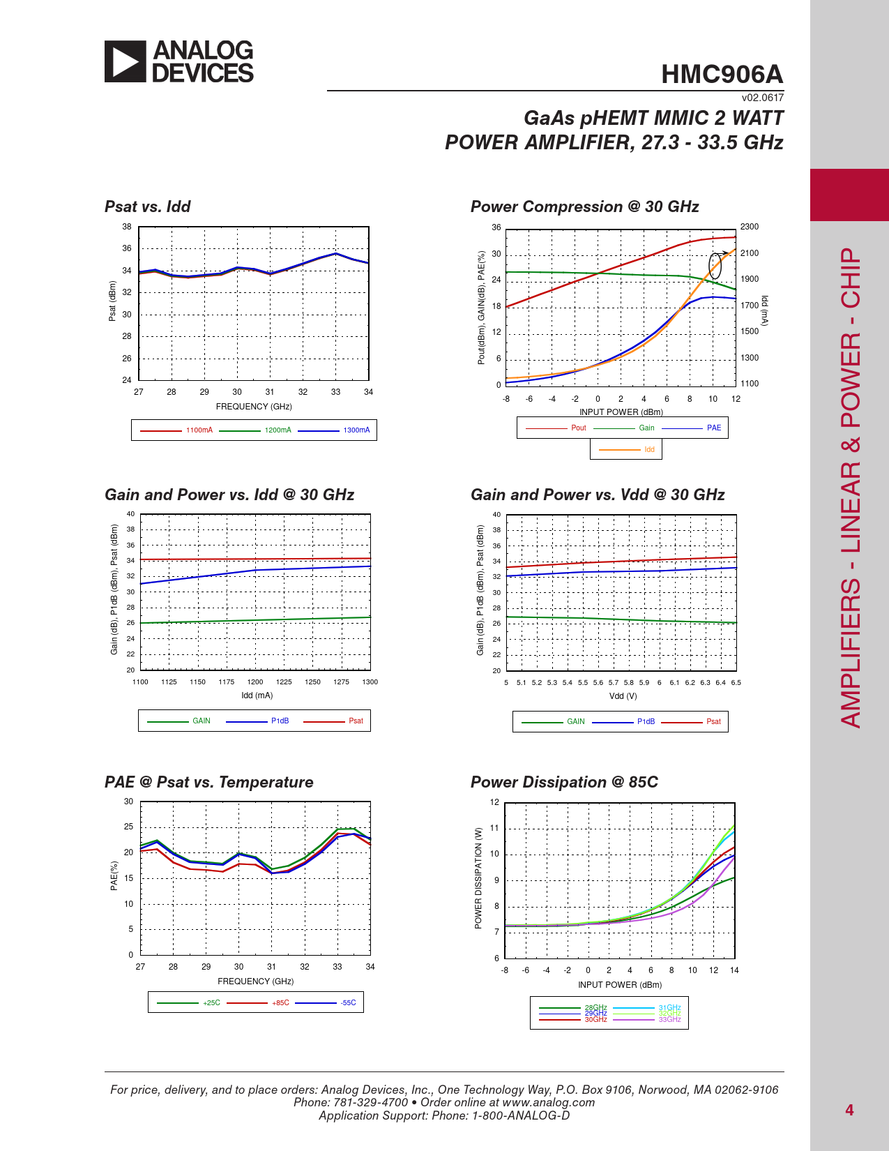 HMC906A. GaAs pHEMT MMIC 2 WATT. POWER AMPLIFIER, 27.3 - 33.5 GHz. Psat vs. Idd. Power Compression @ 30 GHz