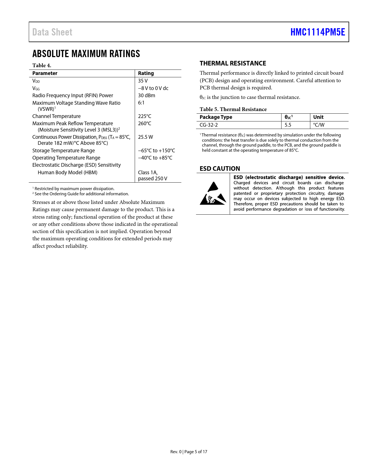 Data Sheet HMC1114PM5E ABSOLUTE MAXIMUM RATINGS Table 4 THERMAL RESISTANCE Parameter Rating Table 5 Thermal Resistance