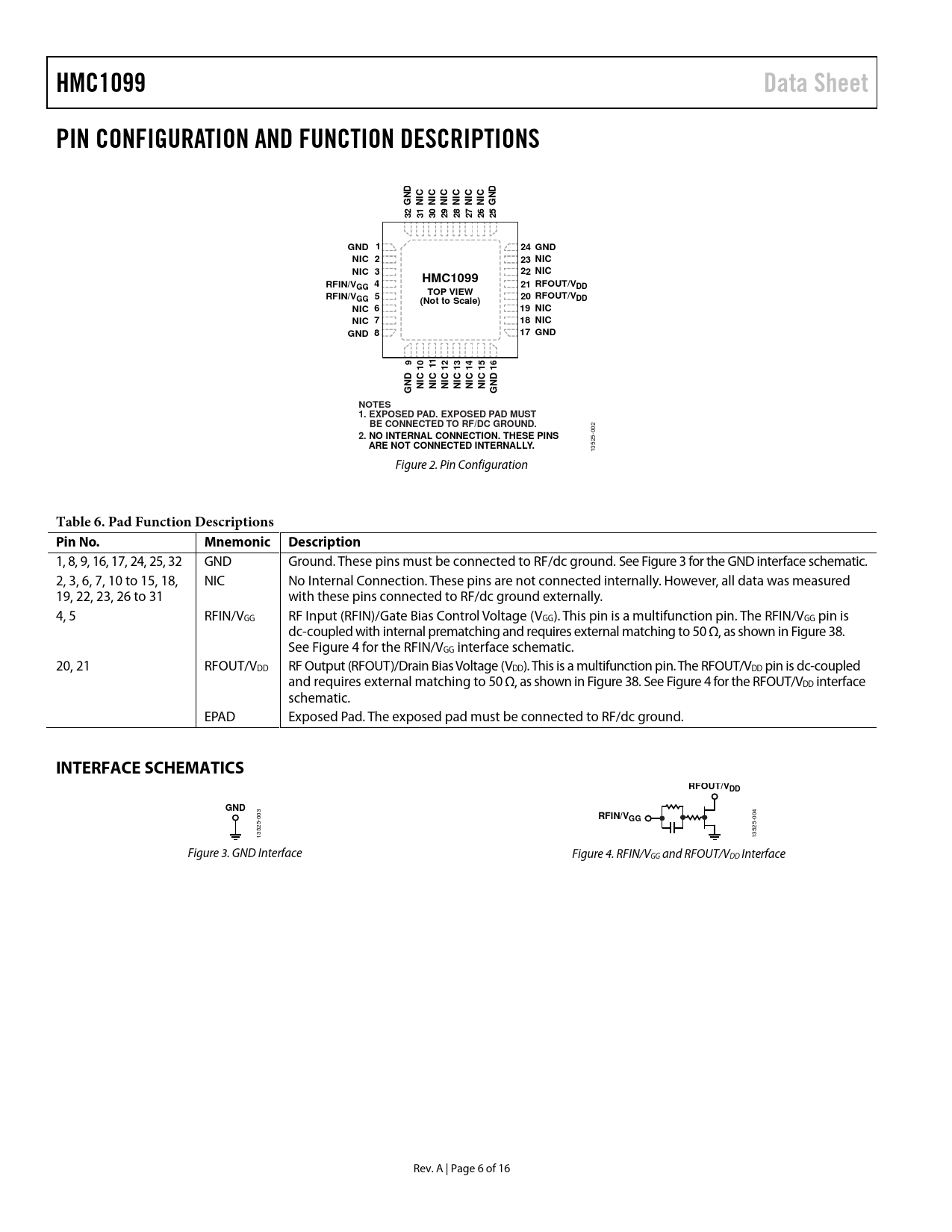 1, 8, 9, 16, 17, 24, 25, 32 GND Ground. These pins must be connected to RF/dc ground. See Figure 3 for the GND interface schematic. 2, 3, 6, 7, 10 to 15, 18, NIC No Internal Connection. These pins are not connected internally. However, all data was measured 19, 22, 23, 26 to 31 with these pins connected to RF/dc ground externally. 4, 5 RFIN/VGG RF Input (RFIN)/Gate Bias Control Voltage (VGG). This pin is a multifunction pin. The RFIN/VGG pin is dc-coupled with internal prematching and requires external matching to 50 Ω, as shown in Figure 38. See Figure 4 for the RFIN/VGG interface schematic. 20, 21 RFOUT/VDD RF Output (RFOUT)/Drain Bias Voltage (VDD). This is a multifunction pin. The RFOUT/VDD pin is dc-coupled and requires external matching to 50 Ω, as shown in Figure 38. See Figure 4 for the RFOUT/VDD interface schematic. EPAD Exposed Pad. The exposed pad must be connected to RF/dc ground.