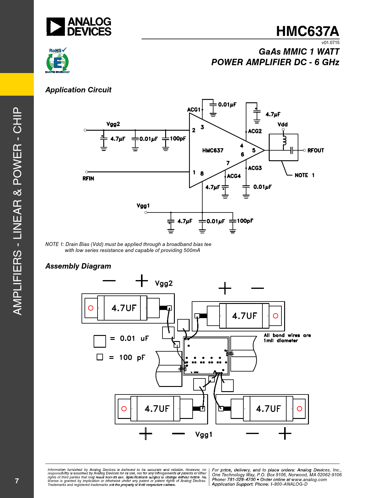 HMC637A v01.0715 GaAs MMIC 1 WATTPOWER AMPLIFIER DC - 6 GHzApplication Circuit IP H R - C E W O R & P A E IN NOTE 1: Drain Bias (Vdd) must be applied through a broadband bias tee S - L with low series resistance and capable of providing 500mA R IE Assembly Diagram LIF P M A Informat F io o n r p furn risihcee d , d by e An lialvoe g rDy a evic n e d t s is o p belie lva e c d t e o o b rd e a e cc rursa: A te a n n a d lo reli g D able. e H v o ic weveers, I no For price, delivery, and to place orders: Analog Devices, Inc., responsibility is assumed by Analog Devices for its use, nor for any infringements of patents or other nc., 2 Elizabeth Drive, Chelmsford, MA 01824 One Technology Way, P.O. Box 9106, Norwood, MA 02062-9106 Phone: 978-250-3343 • Fax: 978-250-3373 • O rights of third parties that may result from its use. Specifications subject to change without notice. No rd Ph e o r O ne n : 7 -l 81 i-n 3 e a 29-4t w 70 ww 0 • O .h rd iettit r o e nli.c n om 7 license is granted by implication or otherwise under any patent or patent rights of Analog Devices. e at www.analog.com Application Support: Pho Trademarks and registered trademarks are the property of their respective owners.ne: 978-250-33A4 p3 p o lic ra a tiopp n S su@ p h po irtttit : Pe. hocnom e: 1-800-ANALOG-D