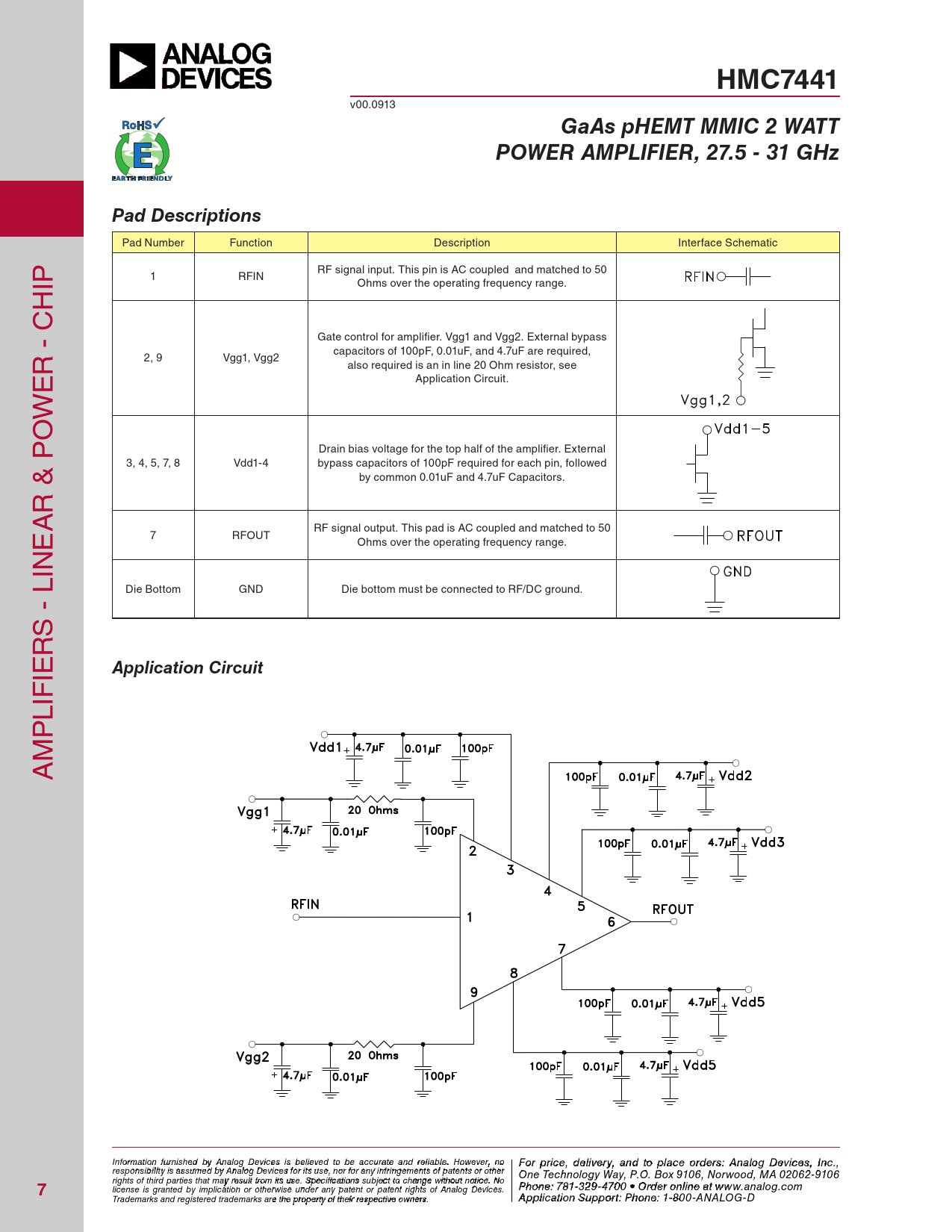 HMC7441. GaAs pHEMT MMIC 2 WATT. POWER AMPLIFIER, 27.5 - 31 GHz. Pad Descriptions. Application Circuit