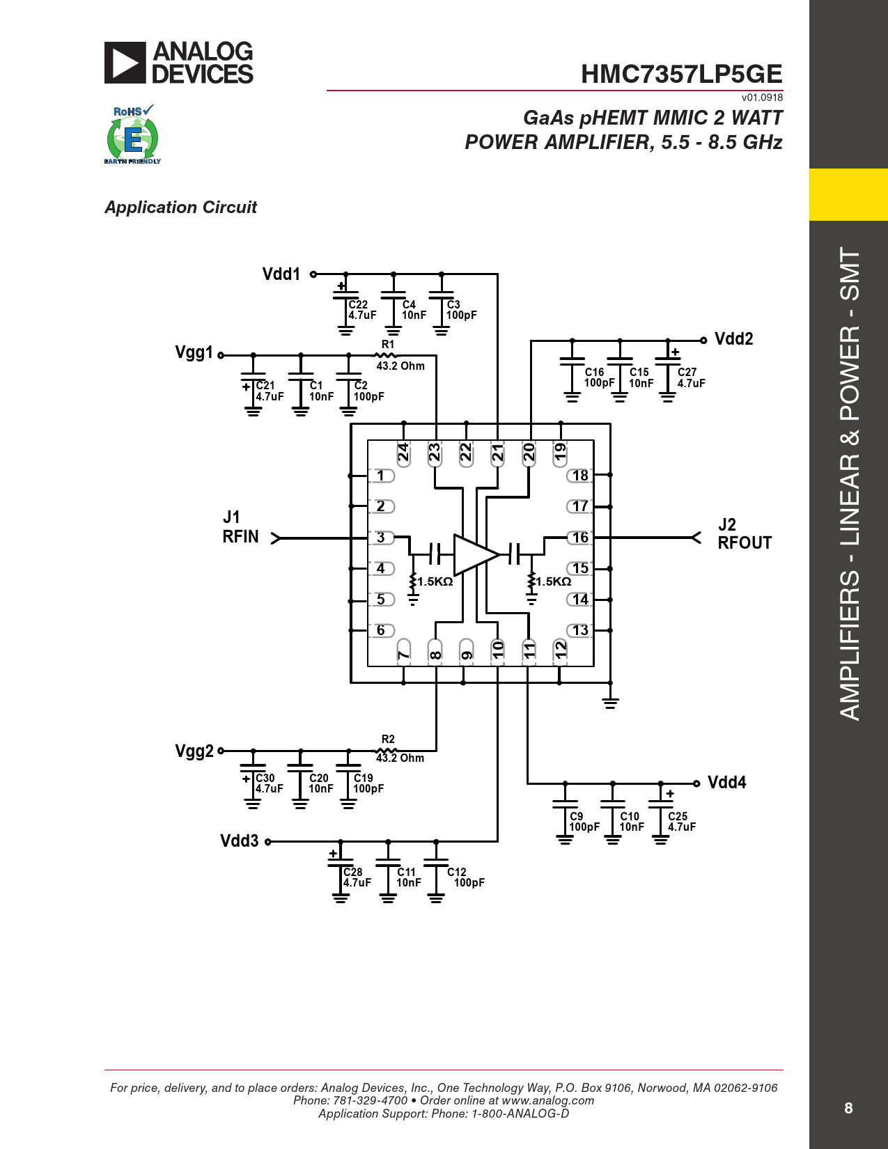 HMC7357LP5GE v01.0918 GaAs pHEMT MMIC 2 WATTPOWER AMPLIFIER, 5.5 - 8.5 GHzApplication Circuit T Vdd1 M C22C4C34.7uF10nF100pFR1Vdd2 R - S Vgg1 E 43.2 OhmC16C15C27C21C1C2100pF 10nF4.7uF W 4.7uF10nF100pF O 242322212019 R & P 118 A 217 E J1J2 IN RFIN316RFOUT4151.5KΩ1.5KΩ S - L 514 R IE 613178910112 LIF P M A Vgg2R243.2 Ohm 000 C30C20C194.7uF10nF100pFVdd4 00000- C9C10C25100pF10nF4.7uFVdd3C28C11C124.7uF10nF100pF For price, delivery, and to place orders: Analog Devices, Inc., One Technology Way, P.O. Box 9106, Norwood, MA 02062-9106 Phone: 781-329-4700 • Order online at www.analog.com Application Support: Phone: 1-800-ANALOG-D 8 Document Outline Typical Applications Features General Description Functional Diagram Electrical Specifications Gain & Return Loss Gain vs. Temperature Input Return Loss vs. Temperature Output Return Loss vs. Temperature P1dB vs. Temperature P1dB vs Supply Voltage Output IP3 vs. Supply Voltage, Pout/tone = +20 dBm Output IM3 @ Vdd = +6V Output IM3 @ Vdd =+7V Output IM3 @ Vdd = +8V Power Compression @ 6 GHz Power Compression @ 7 GHz Absolute Maximum Ratings Typical Supply Current vs. Vdd Outline Drawing Package Information Application Circuit List of Materials for Evaluation PCB EV1HMC7357LP5 [1] Evaluation PCB Pin Descriptions Gain & Power vs. Supply Current @ 7 GHz Gain & Power vs. Supply Voltage @ 7 GHz Power Compression @ 8 GHz Reverse Isolation vs. Temperature Output IP3 vs. Temperature, Pout/tone = +20 dBm Output IP3 vs. Supply Current, Pout/tone = +20 dBm P1dB vs. Supply Current Psat vs. Supply Current Psat vs. Temperature Psat vs. Supply Voltage