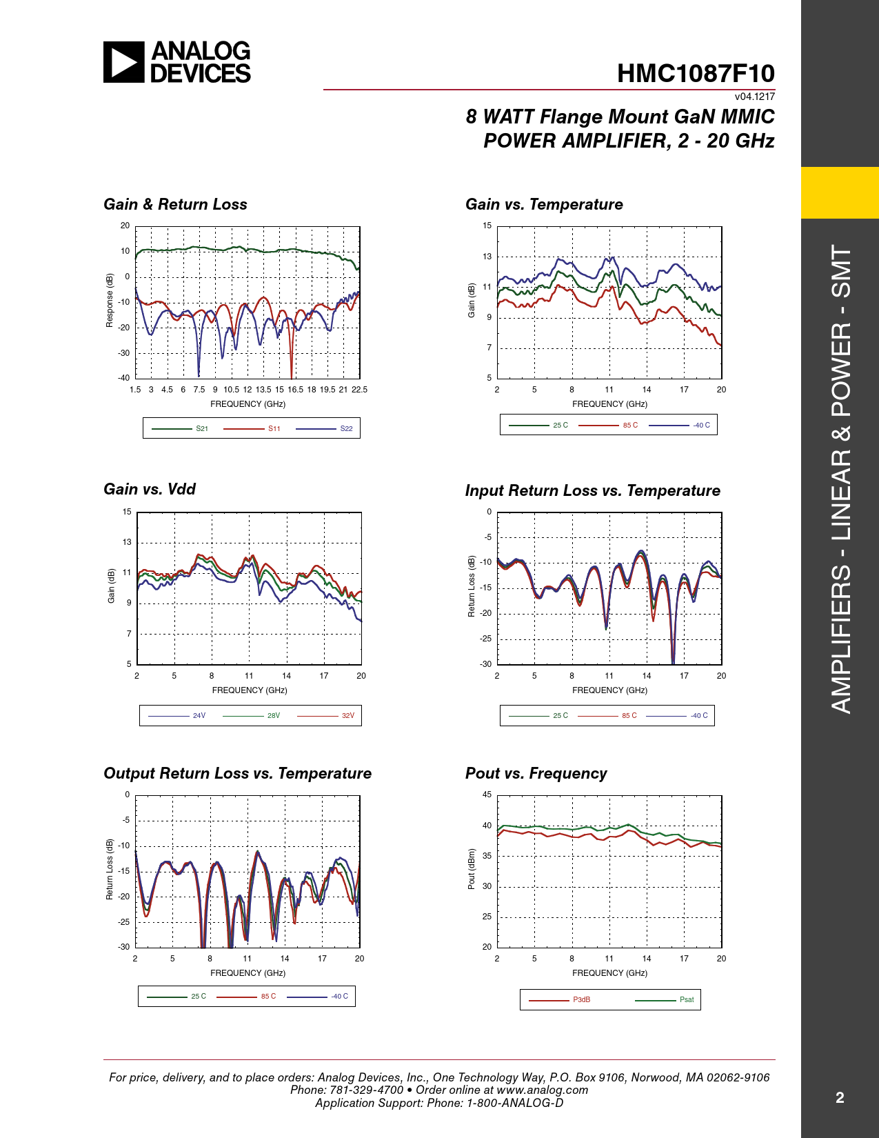 HMC1087F10. 8 WATT Flange Mount GaN MMIC. POWER AMPLIFIER, 2 - 20 GHz. Gain & Return Loss. Gain vs. Temperature. Gain vs. Vdd