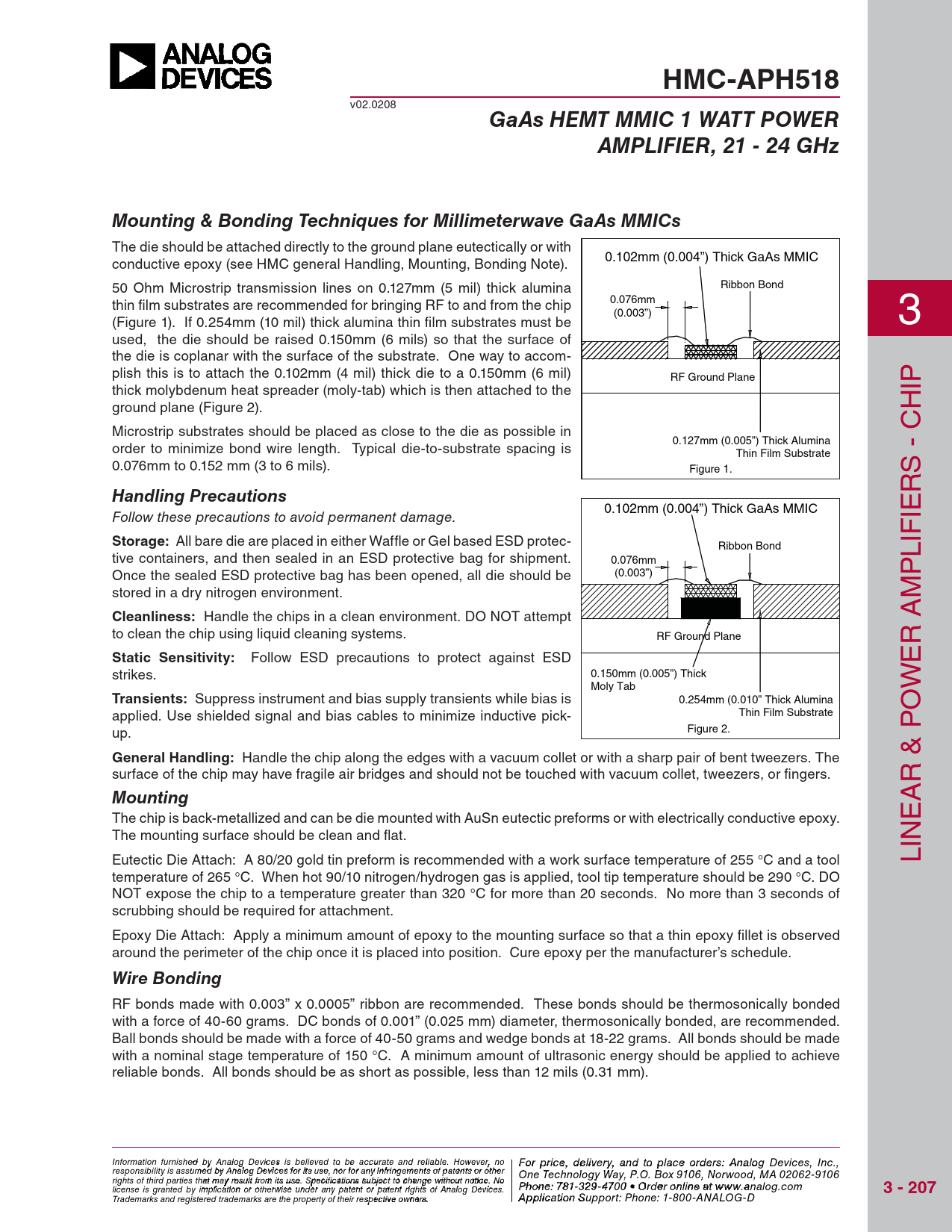 RF bonds made with 0.003” x 0.0005” ribbon are recommended. These bonds should be thermosonically bonded with a force of 40-60 grams. DC bonds of 0.001” (0.025 mm) diameter, thermosonically bonded, are recommended. Ball bonds should be made with a force of 40-50 grams and wedge bonds at 18-22 grams. All bonds should be made with a nominal stage temperature of 150 °C. A minimum amount of ultrasonic energy should be applied to achieve reliable bonds. All bonds should be as short as possible, less than 12 mils (0.31 mm). Information furnish F e o d r pri by An ce, de alog Devic leis vie s rby eli, a eve nd to pla d to be accur ce o ate an r d der relia s ble , pl . Ho ease co wever, no For price, delivery, and to place orders: Analog Devices, Inc., responsibility is assumed by Analog Devices for its use, nor for any infringements of patents or other ntact Hittite Microwave Corporation: One Technology Way, P.O. Box 9106, Norwood, MA 02062-9106 20 Alpha Road, Chelmsford, MA 01824 Phone rights of third parties that may result from its use. Specifications subject to change without notice. No : 978 Phon -e25 : 7 0 81 - - 3 3 3 29 4 - 3 F 470 ax 0 • O : 978 rder o - nl 25 in 0 e a - t 33 ww 73 license is granted by implication or otherwise under any patent or patent rights of Analog Devices. w.analog.com