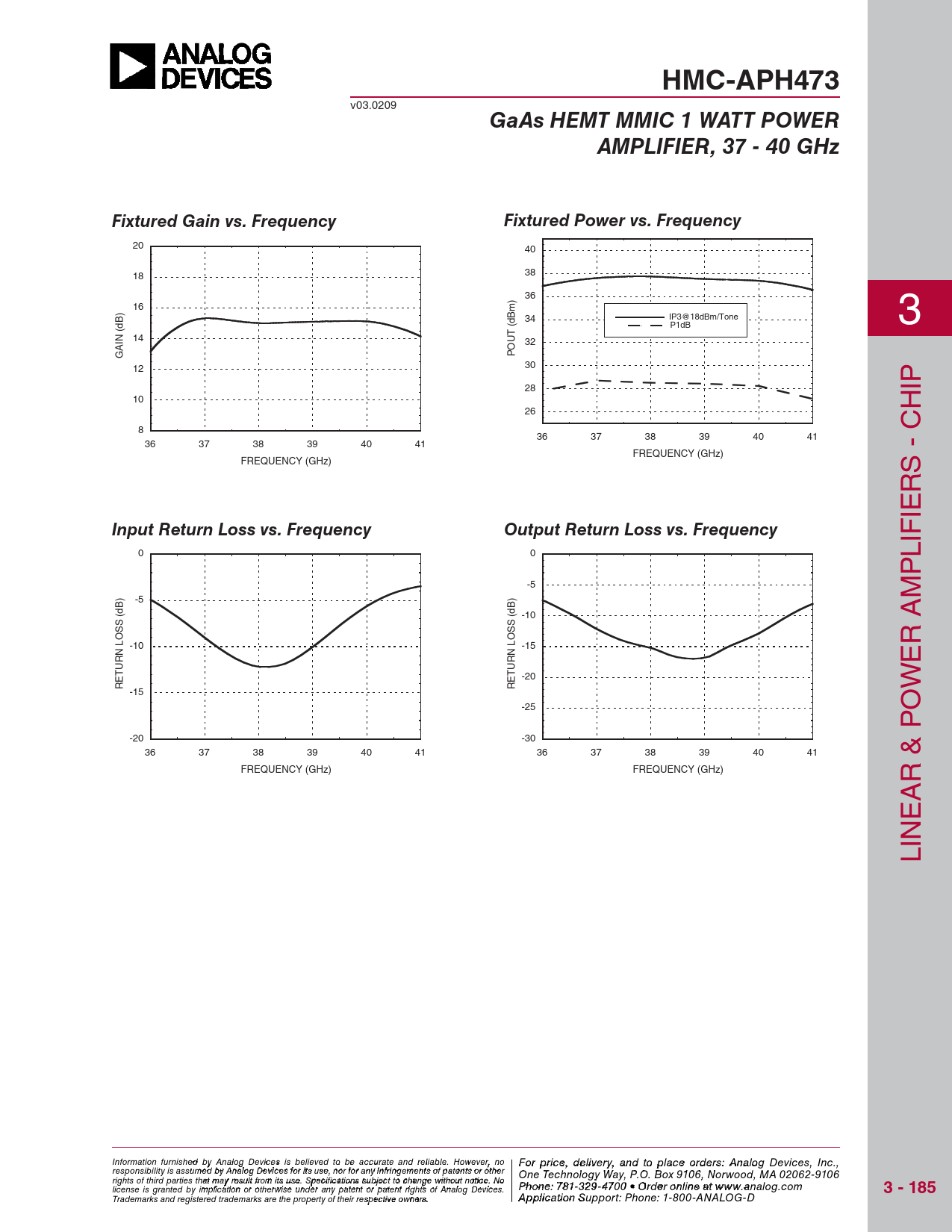 HMC-APH473 v03.0209 GaAs HEMT MMIC 1 WATT POWERAMPLIFIER, 37 - 40 GHzFixtured Gain vs. FrequencyFixtured Power vs. Frequency 20 40 18 38 36 16 34 IP3@18dBm/Tone P1dB 3 (dB) 14 32 GAIN POUT (dBm) 12 30 28 IP 10 H 26 8 36 37 38 39 40 41 36 37 38 39 40 41 FREQUENCY (GHz) FREQUENCY (GHz) S - C R IE Input Return Loss vs. FrequencyOutput Return Loss vs. Frequency IF 0 0 L P -5 M -5 -10 R A -10 -15 E -20 RETURN LOSS (dB) RETURN LOSS (dB) W -15 -25 O -20 -30 36 37 38 39 40 41 36 37 38 39 40 41 FREQUENCY (GHz) FREQUENCY (GHz) R & P A E IN L Information furnish F e o d r pri by An ce, de alog Devic leis vie s rby eli, a eve nd to pla d to be accur ce o ate an r d der relia s ble , pl . Ho ease co wever, no For price, delivery, and to place orders: Analog Devices, Inc., responsibility is assumed by Analog Devices for its use, nor for any infringements of patents or other ntact Hittite Microwave Corporation: One Technology Way, P.O. Box 9106, Norwood, MA 02062-9106 20 Alpha Road, Chelmsford, MA 01824 Phone rights of third parties that may result from its use. Specifications subject to change without notice. No : 978 Phon -e25 : 7 0 81 - - 3 3 3 29 4 - 3 F 470 ax 0 • O : 978 rder o - nl 25 in 0 e a - t 33 ww 73 license is granted by implication or otherwise under any patent or patent rights of Analog Devices. w.analog.com 3 - 185 Order On- Trademarks and registered trademarks are the property of their respective owners. line at www.hi A tptipte.co licatio m n Support: Phone: 1-800-ANALOG-D