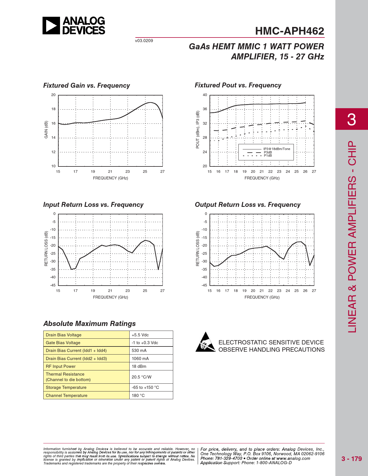IN L Drain Bias Voltage +5.5 Vdc Gate Bias Voltage -1 to +0.3 Vdc ELECTROSTATIC SENSITIVE DEVICE Drain Bias Current (Idd1 + Idd4) 530 mA OBSERVE HANDLING PRECAUTIONS Drain Bias Current (Idd2 + Idd3) 1060 mA RF Input Power 18 dBm Thermal Resistance 20.5 °C/W (Channel to die bottom) Storage Temperature -65 to +150 °C Channel Temperature 180 °C Information furnish F e o d r pri by An ce, de alog Devic leis vie s rby eli, a eve nd to pla d to be accur ce o ate an r d der relia s ble , pl . Ho ease co wever, no For price, delivery, and to place orders: Analog Devices, Inc., responsibility is assumed by Analog Devices for its use, nor for any infringements of patents or other ntact Hittite Microwave Corporation: One Technology Way, P.O. Box 9106, Norwood, MA 02062-9106 20 Alpha Road, Chelmsford, MA 01824 Phone rights of third parties that may result from its use. Specifications subject to change without notice. No : 978 Phon -e25 : 7 0 81 - - 3 3 3 29 4 - 3 F 470 ax 0 • O : 978 rder o - nl 25 in 0 e a - t 33 ww 73 license is granted by implication or otherwise under any patent or patent rights of Analog Devices. w.analog.com
