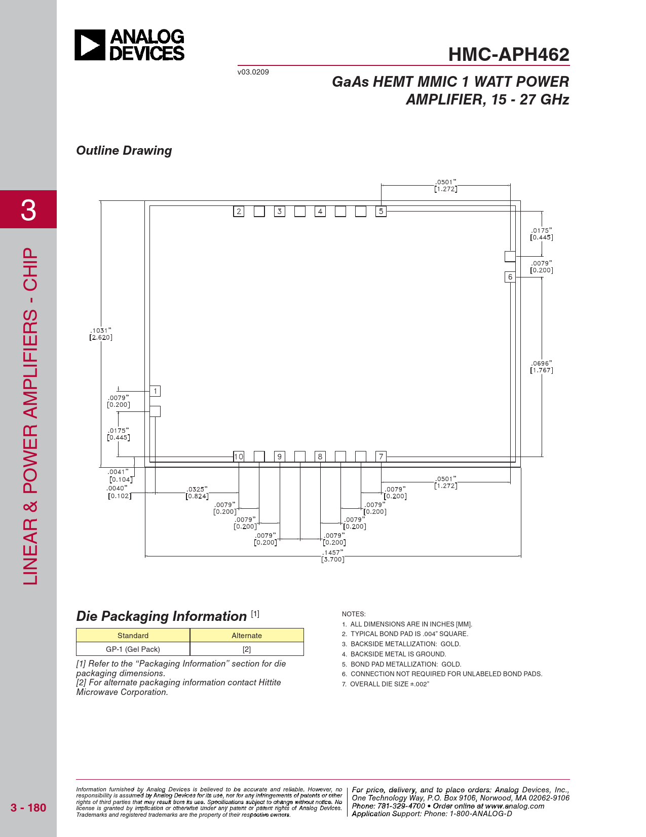 HMC-APH462. GaAs HEMT MMIC 1 WATT POWER. AMPLIFIER, 15 - 27 GHz. Outline Drawing. Die Packaging Information. 3 - 180