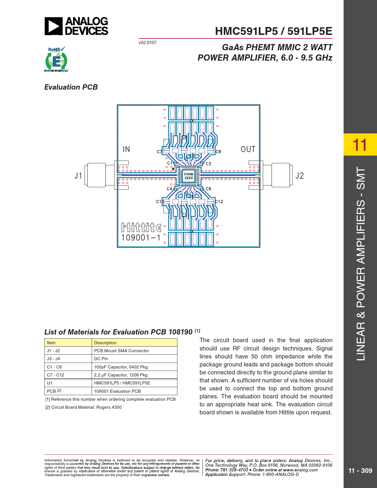 HMC591LP5 / 591LP5E. GaAs PHEMT MMIC 2 WATT. POWER AMPLIFIER, 6.0 - 9.5 GHz. Evaluation PCB
