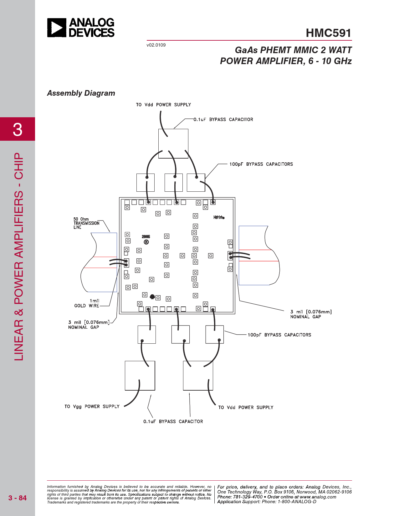 HMC591 v02.0109 GaAs PHEMT MMIC 2 WATTPOWER AMPLIFIER, 6 - 10 GHzAssembly Diagram 3 IP H S - C R IE IF L P M R A E W O R & P A E IN L Information furnish F ed obr pri y Anal ce, de og Device li s vie s r beyli, a eve nd to pla d to be accura ce o te and rder reliabl s e , pl . Ho ease co wever, no For price, delivery, and to place orders: Analog Devices, Inc., responsibility is assumed by Analog Devices for its use, nor for any infringements of patents or other ntact Hittite Microwave Corporation: One Technology Way, P.O. Box 9106, Norwood, MA 02062-9106 rights of third parties that may result from its use. Specifications subject to change without notice. No 3 - 84 20 Alpha Road, Chelmsford, MA 01824 Phone: 978 Phon - e 25 : 7 0 81--3 32 3 9 4 - 3 F 70 ax 0 • O : 978 rder on -li25 n 0 e a - t 33 ww 73 license is granted by implication or otherwise under any patent or patent rights of Analog Devices. w.analog.com Order On Trademarks and registered trademarks are the property of their respective owners. -line at www.h A it p tpite.co licatio m n Support: Phone: 1-800-ANALOG-D